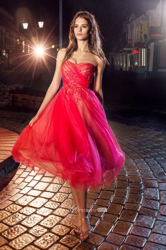 A-Line Knee-Length Strapless Tulle Backless Dress With Criss Cross And Flower