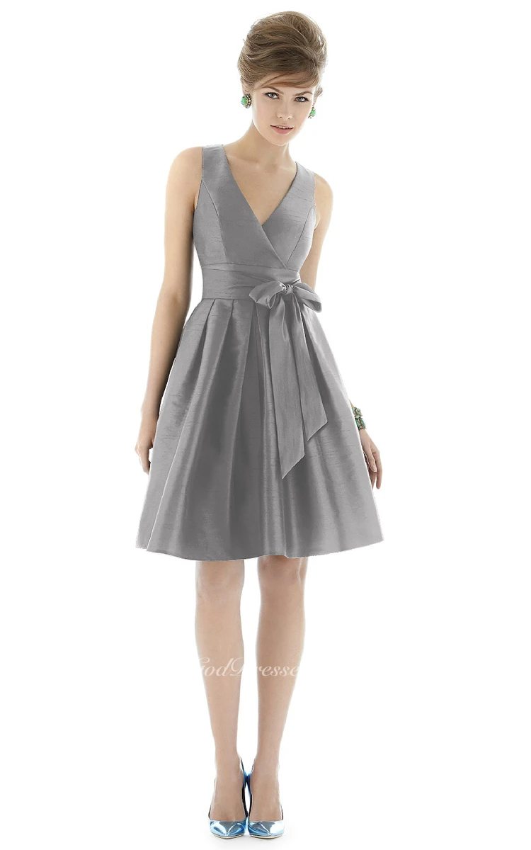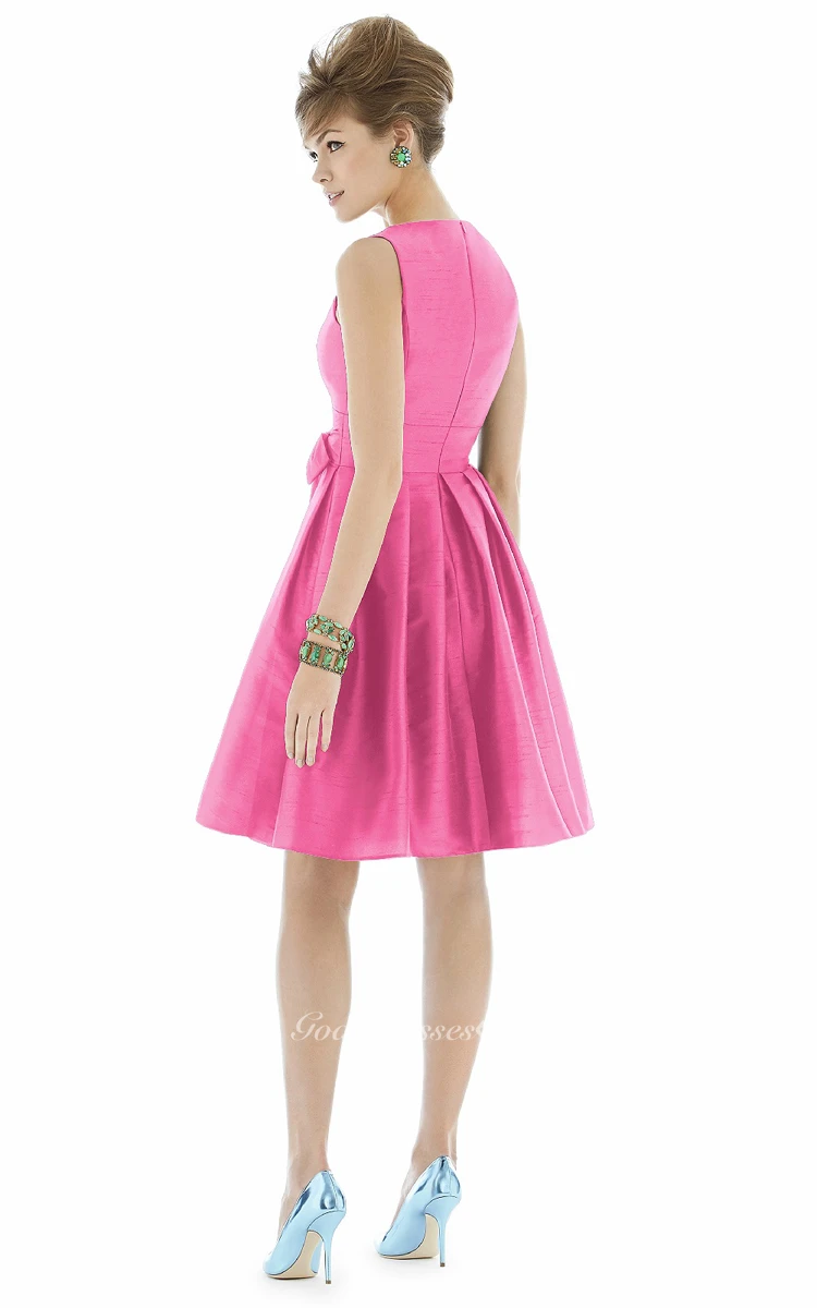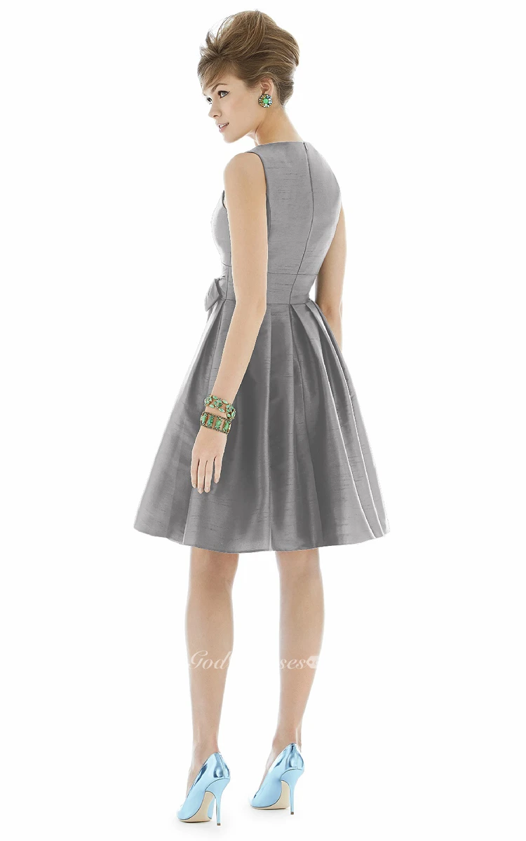 A-Line Knee-Length V-Neck Sleeveless Satin Dress with Bow and Ruching