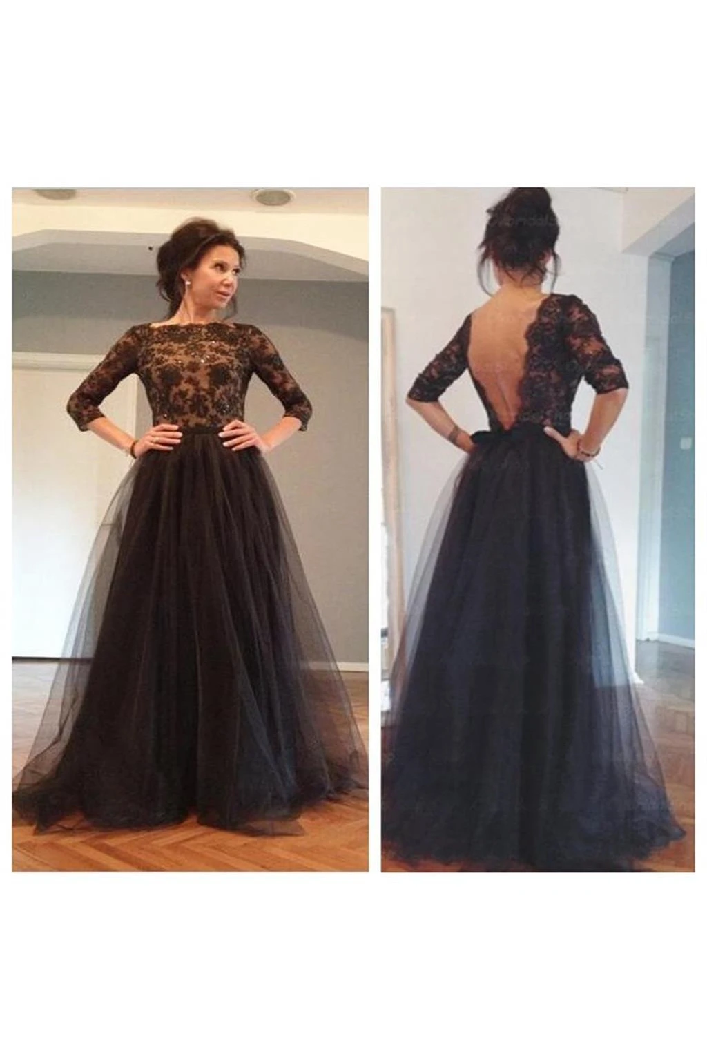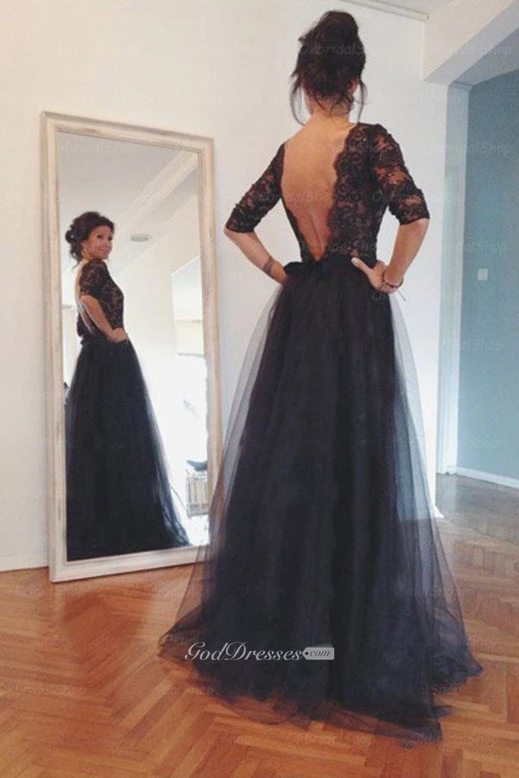 A-Line Lace Tulle Bateau Long Sleeve Open Back Backless Deep-V Back Dress