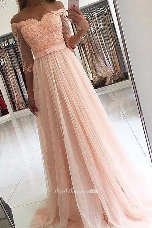 A-Line Lace Tulle Off-the-shoulder Long Sleeve Zipper Dress