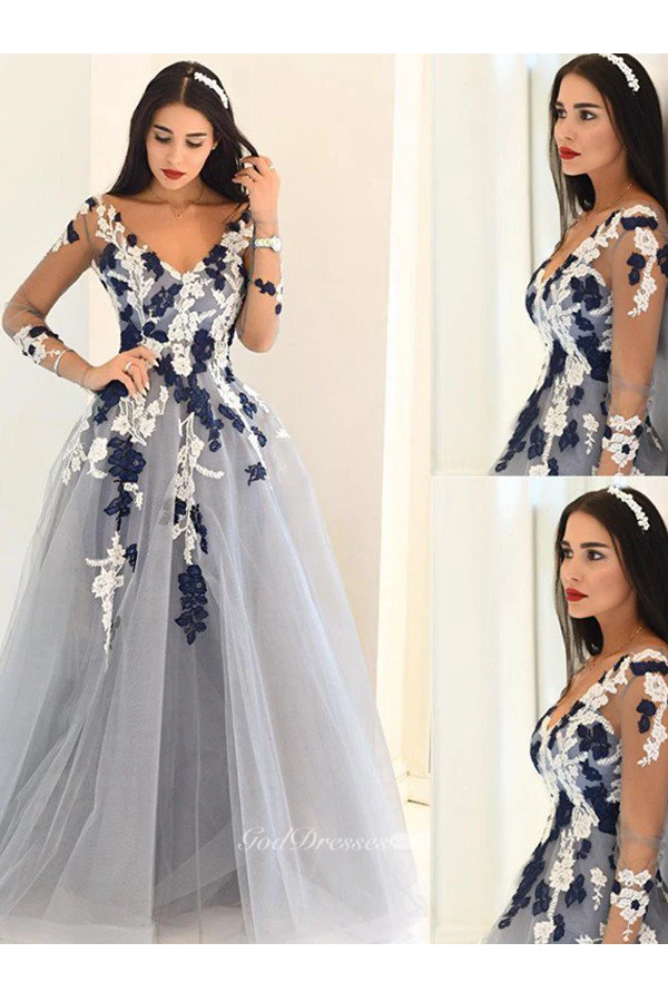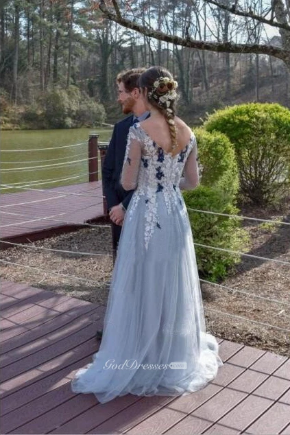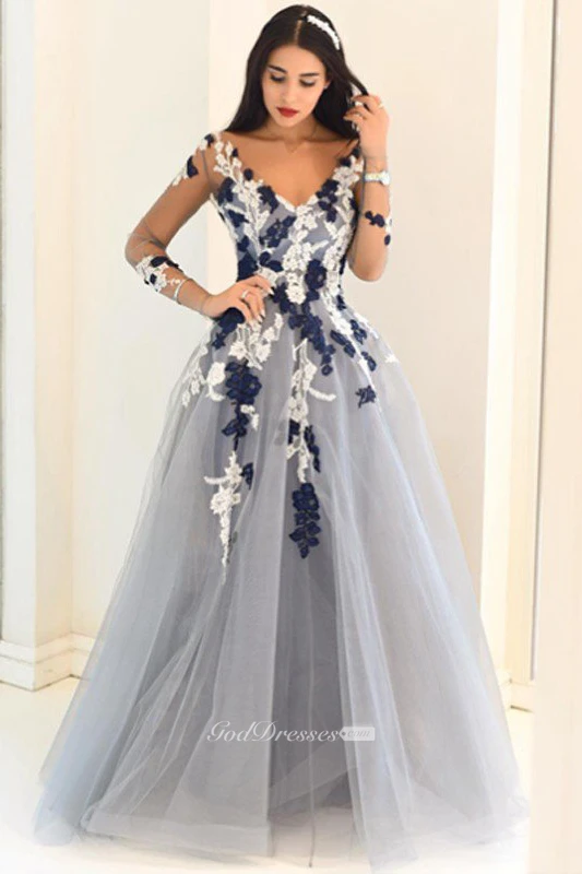 A-Line Lace Tulle V-neck Long Sleeve Low-V Back Dress