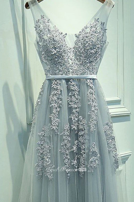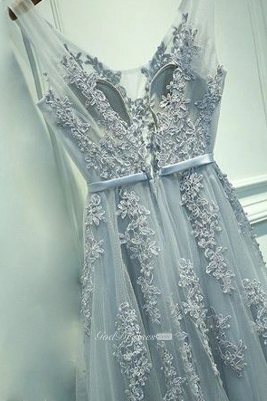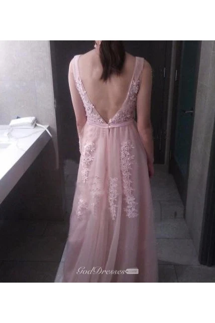 A-Line Lace Tulle V-neck Sleeveless Deep-V Back Dress