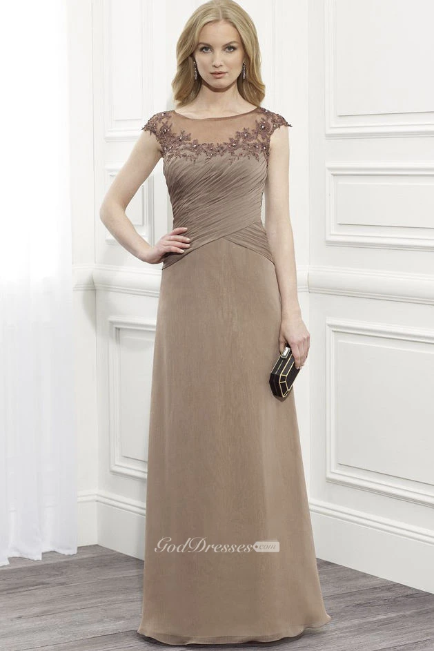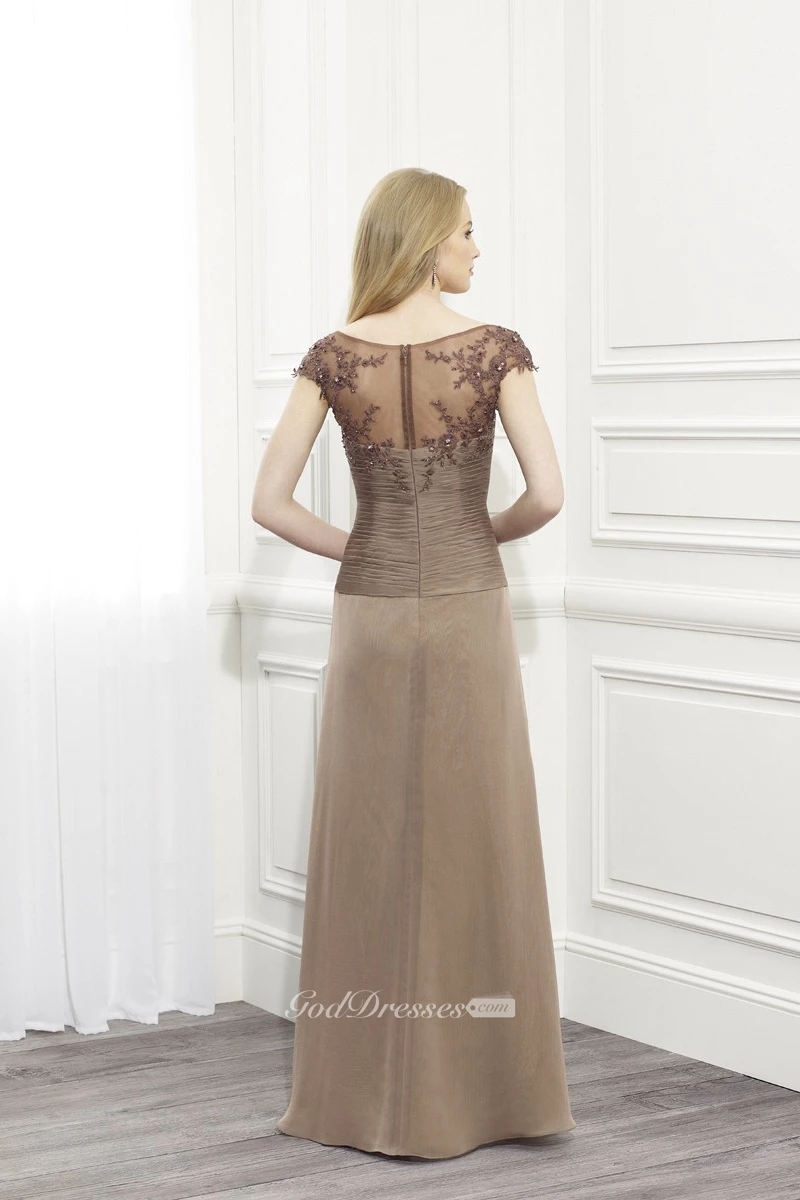 A-Line Long Appliqued Scoop Cap-Sleeve Chiffon Formal Dress With Illusion Back And Ruching