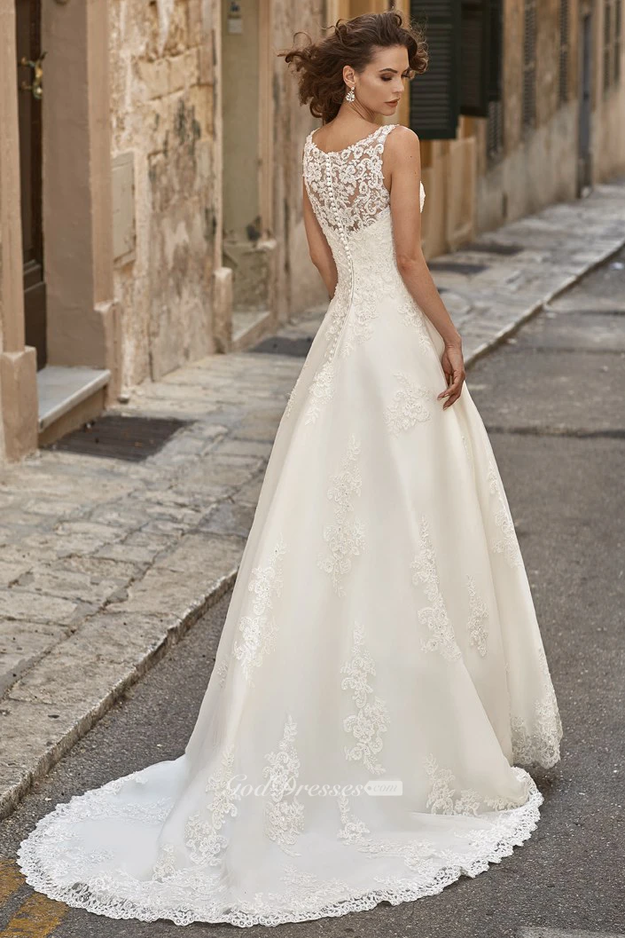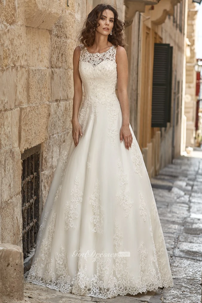 A-Line Long Appliqued Scoop-Neck Sleeveless Lace Wedding Dress