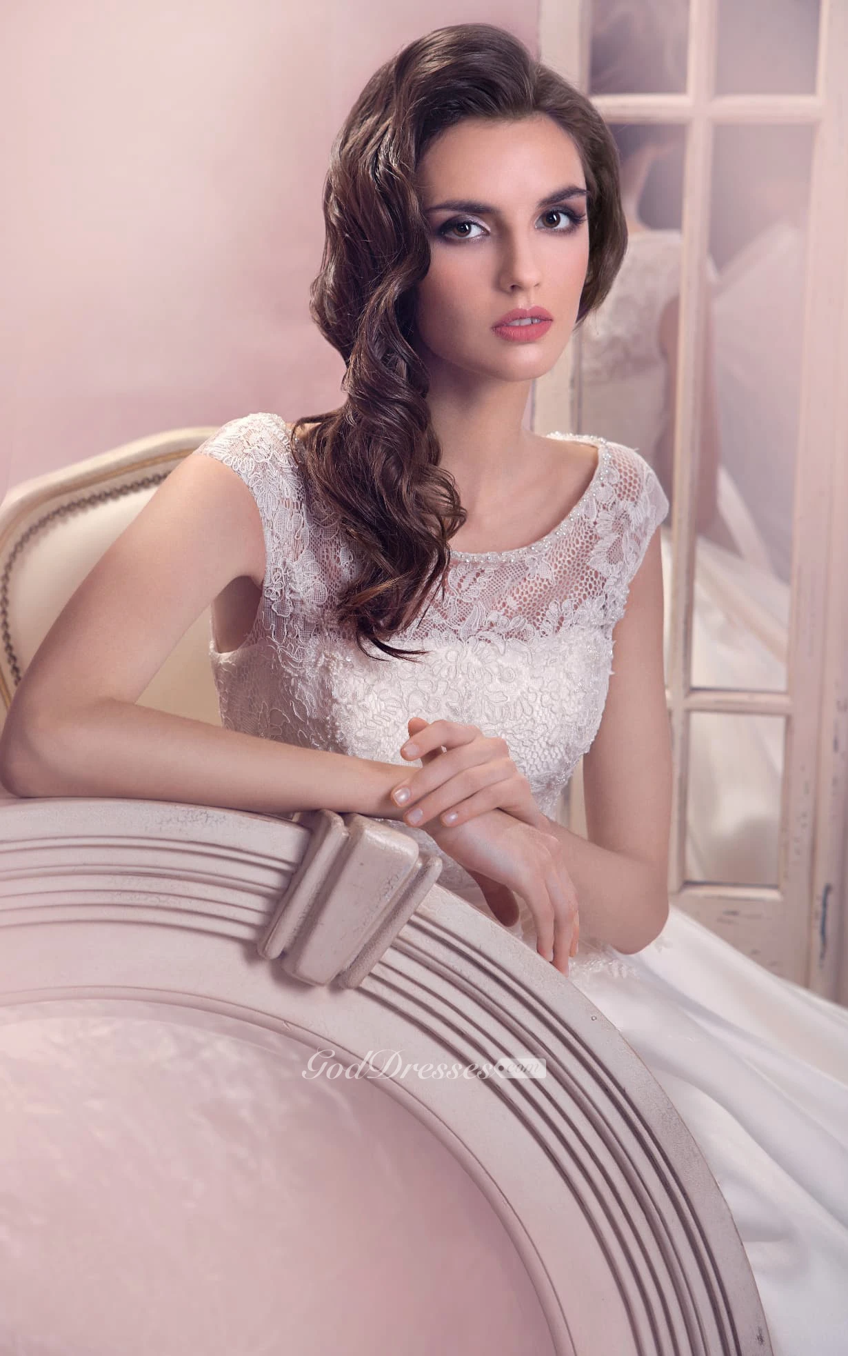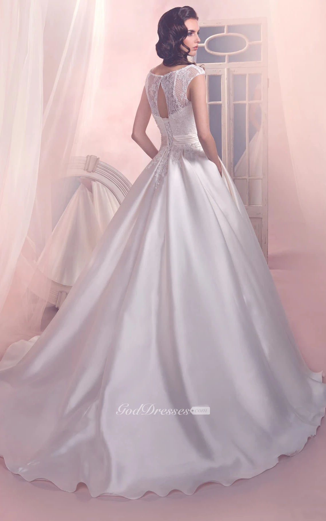 A-Line Long Bateau-Neck Cap-Sleeve Lace-Up Satin Dress With Bow And Pleatings
