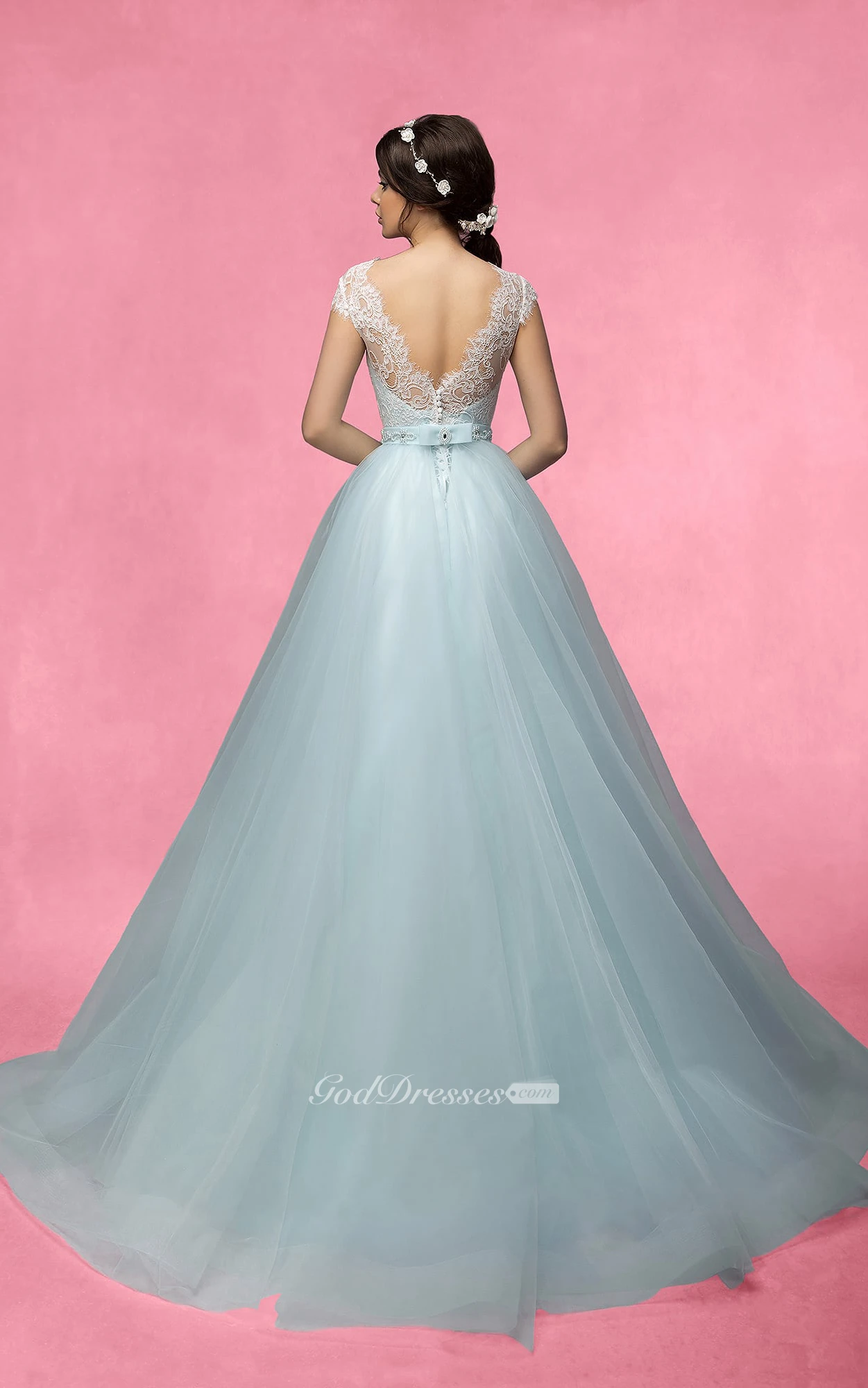 A-Line Long Bateau-Neck Cap-Sleeve Low-V-Back Tulle Lace Dress With Beading And Bow