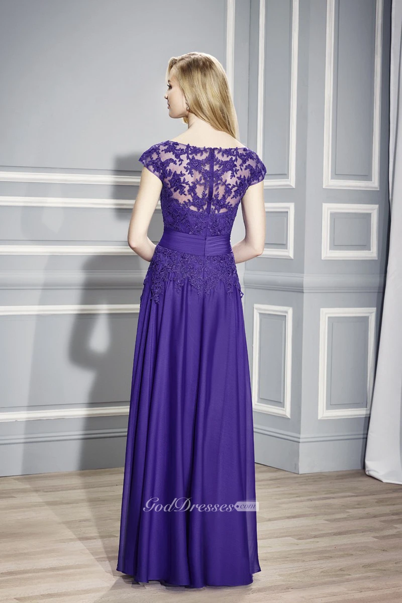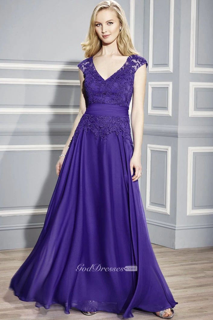 A-Line Long Cap-Sleeve Appliqued V-Neck Chiffon Formal Dress