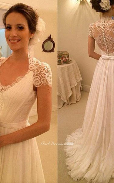 A-Line Long Cap Zipper Lace-Up Back Keyhole Chiffon Lace Dress