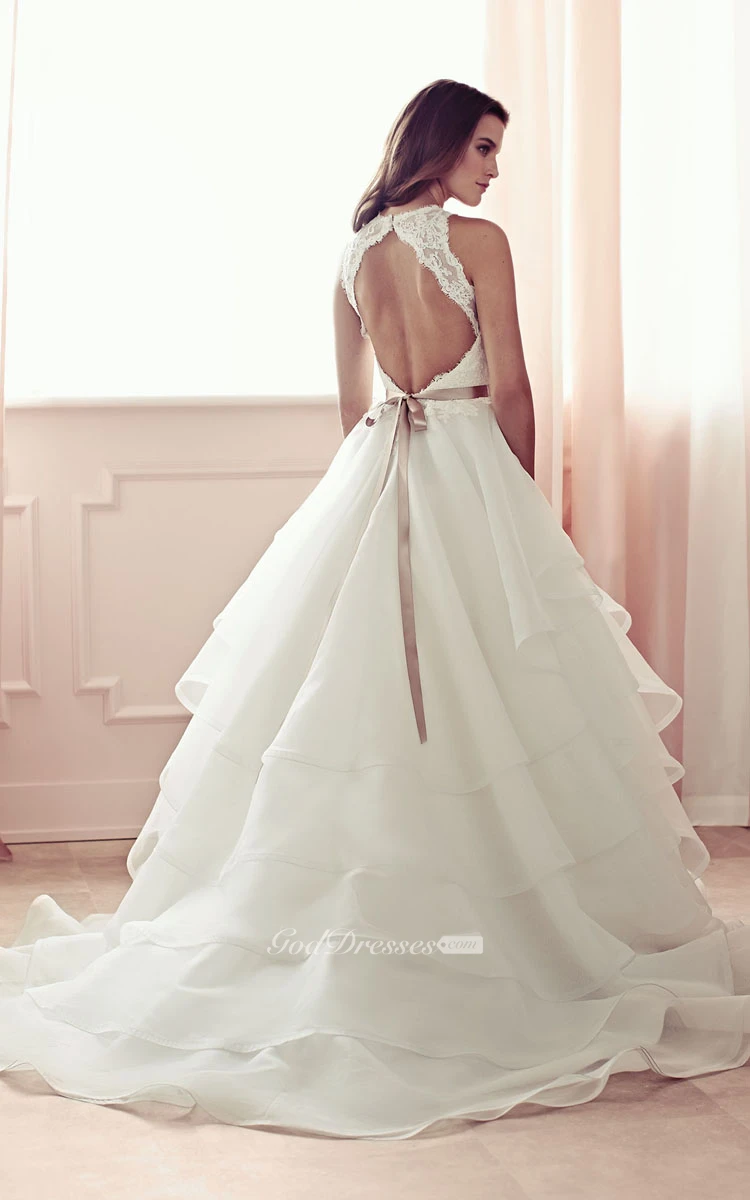 A-Line Long Dress With Lace Bodice And Cascading Ruffles