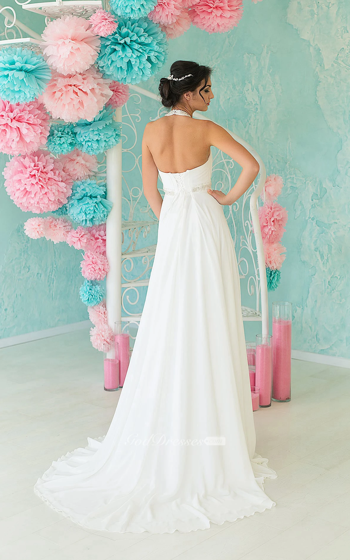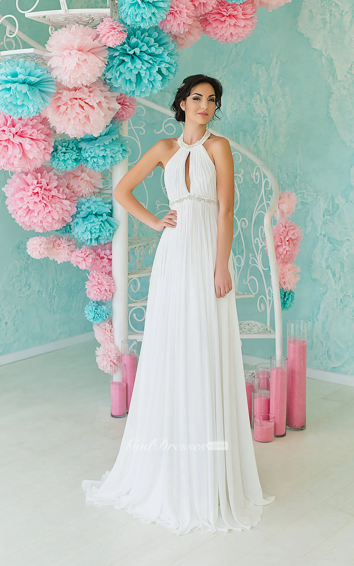 A-Line Long High-Neck Sleeveless Backless Chiffon Dress With Pleats And Beading