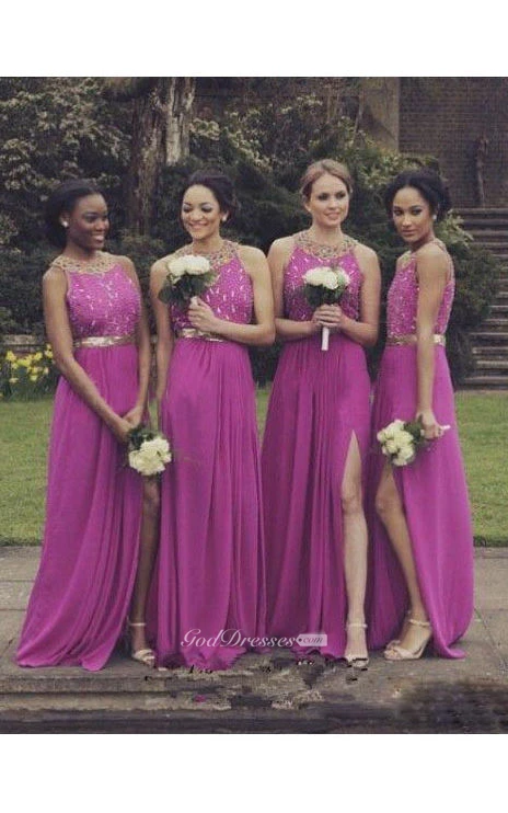 A-line Long High Neck Sleeveless Beading Split Chiffon Dress