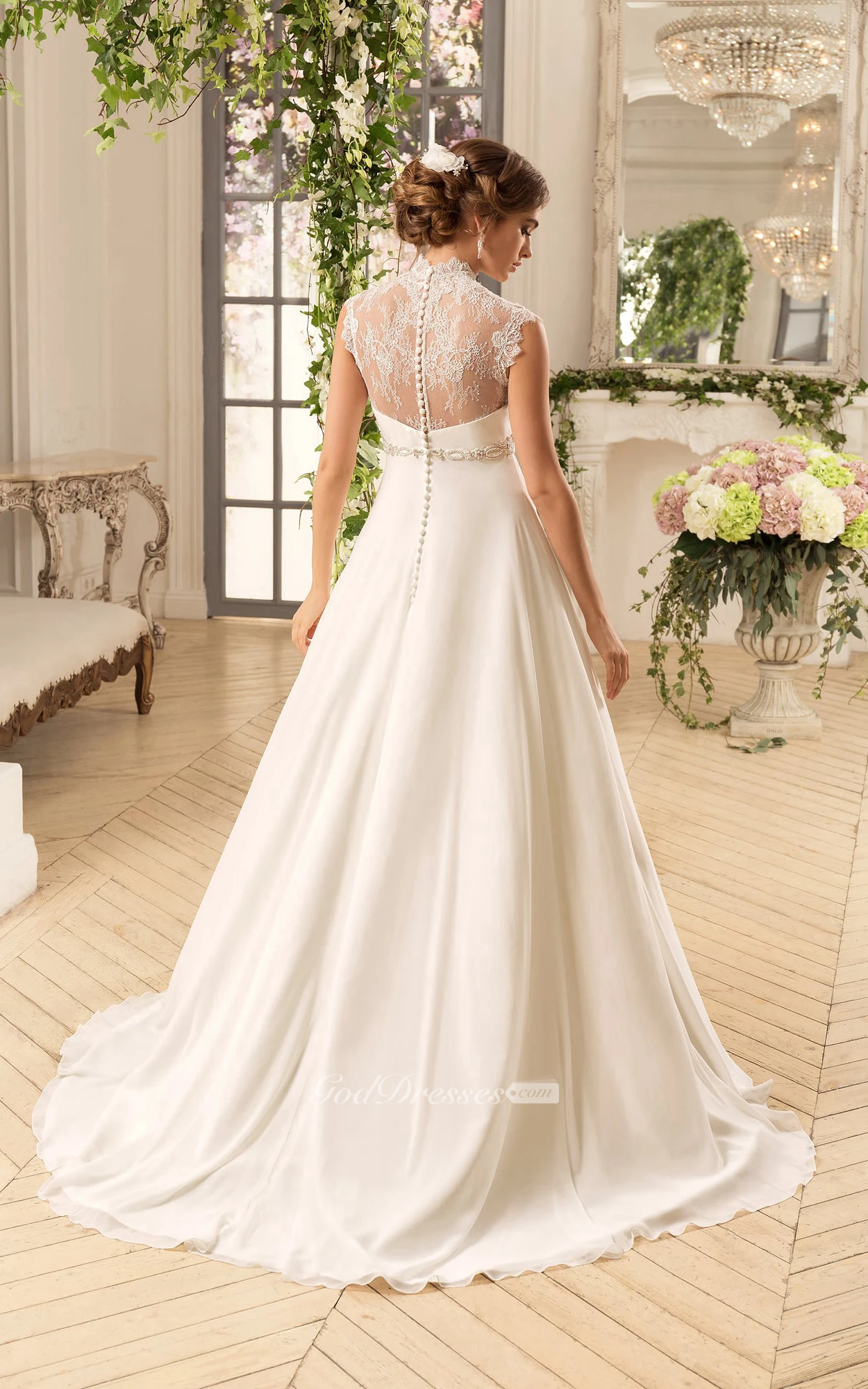 A-Line Long High-Neck Sleeveless Illusion Chiffon Dress With Lace And Waist Jewellery