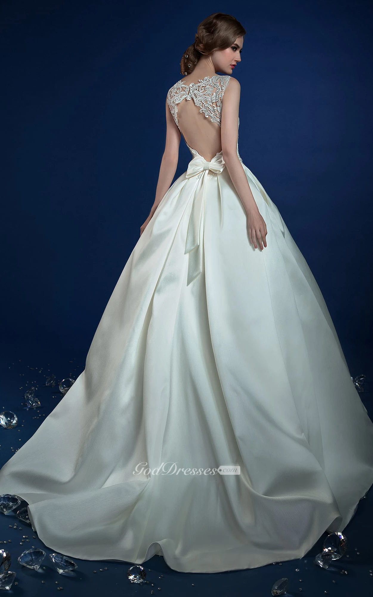 A-Line Long Jewel-Neck Sleeveless Keyhole Satin Dress With Appliques And Beading