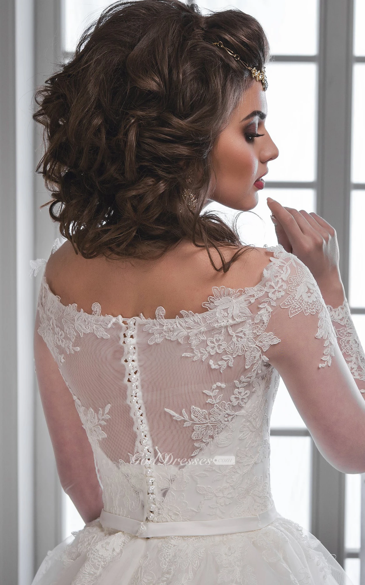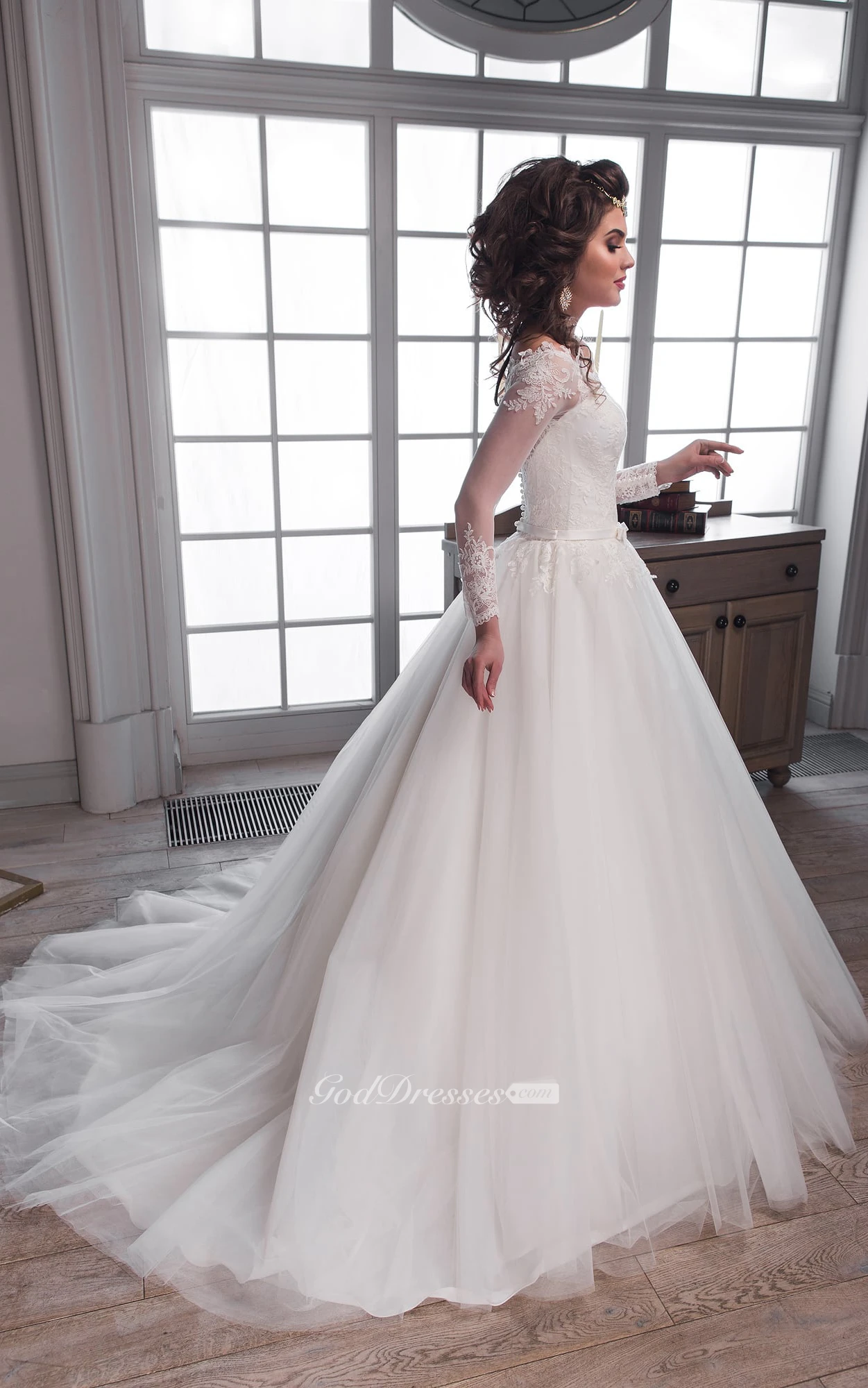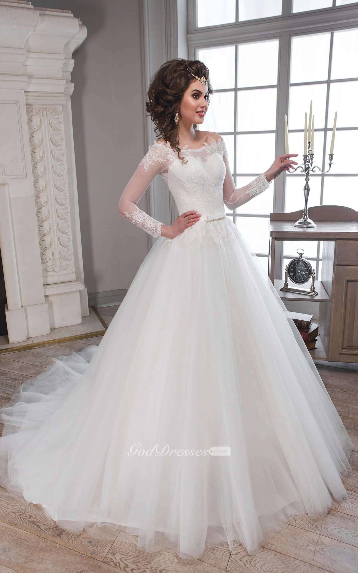A-Line Long Off-The-Shoulder Long-Sleeve Illusion Tulle Dress With Appliques And Pleats