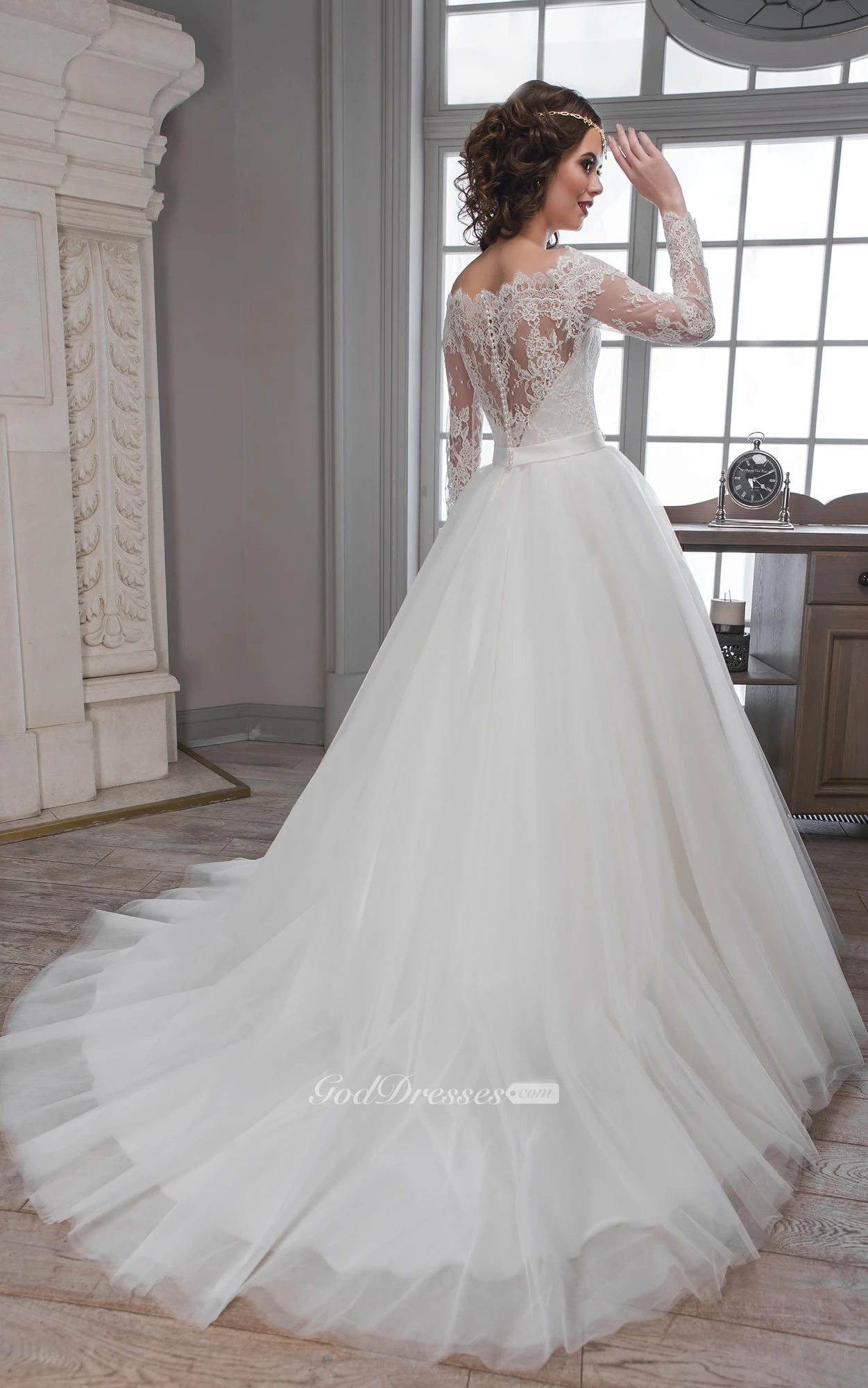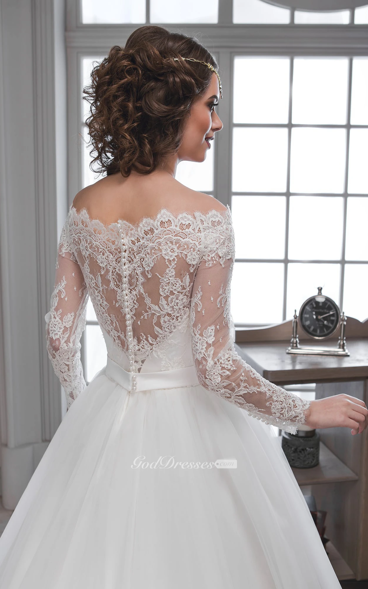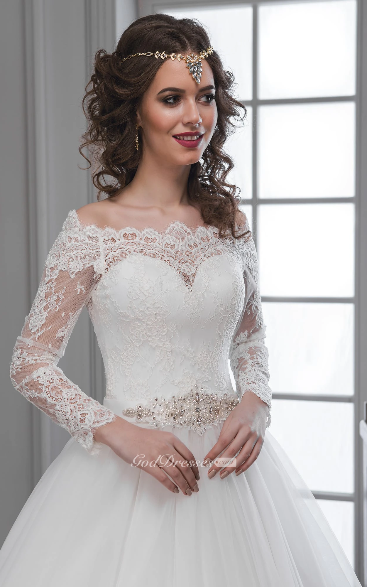 A-Line Long Off-The-Shoulder Long-Sleeve Illusion Tulle Lace Dress With Waist Jewellery