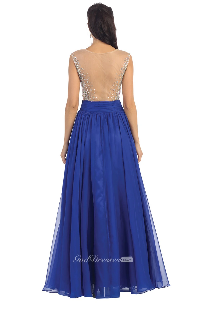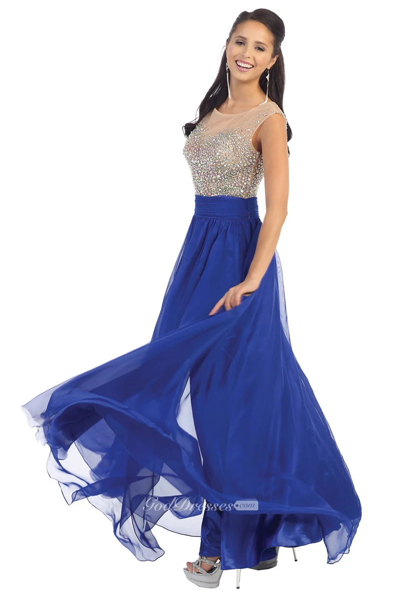 A-Line Long Scoop-Neck Cap-Sleeve Chiffon Illusion Dress With Pleats And Beading