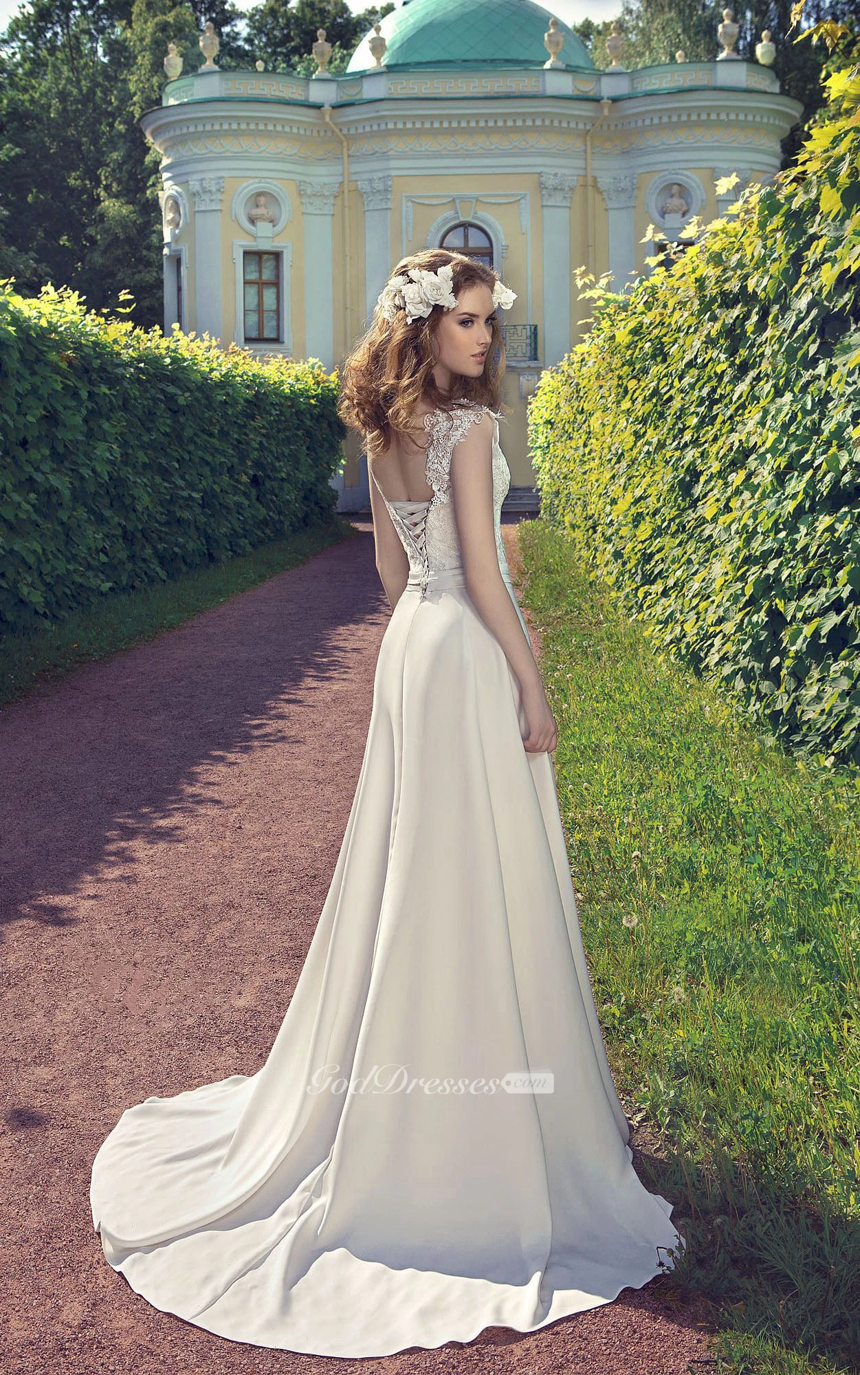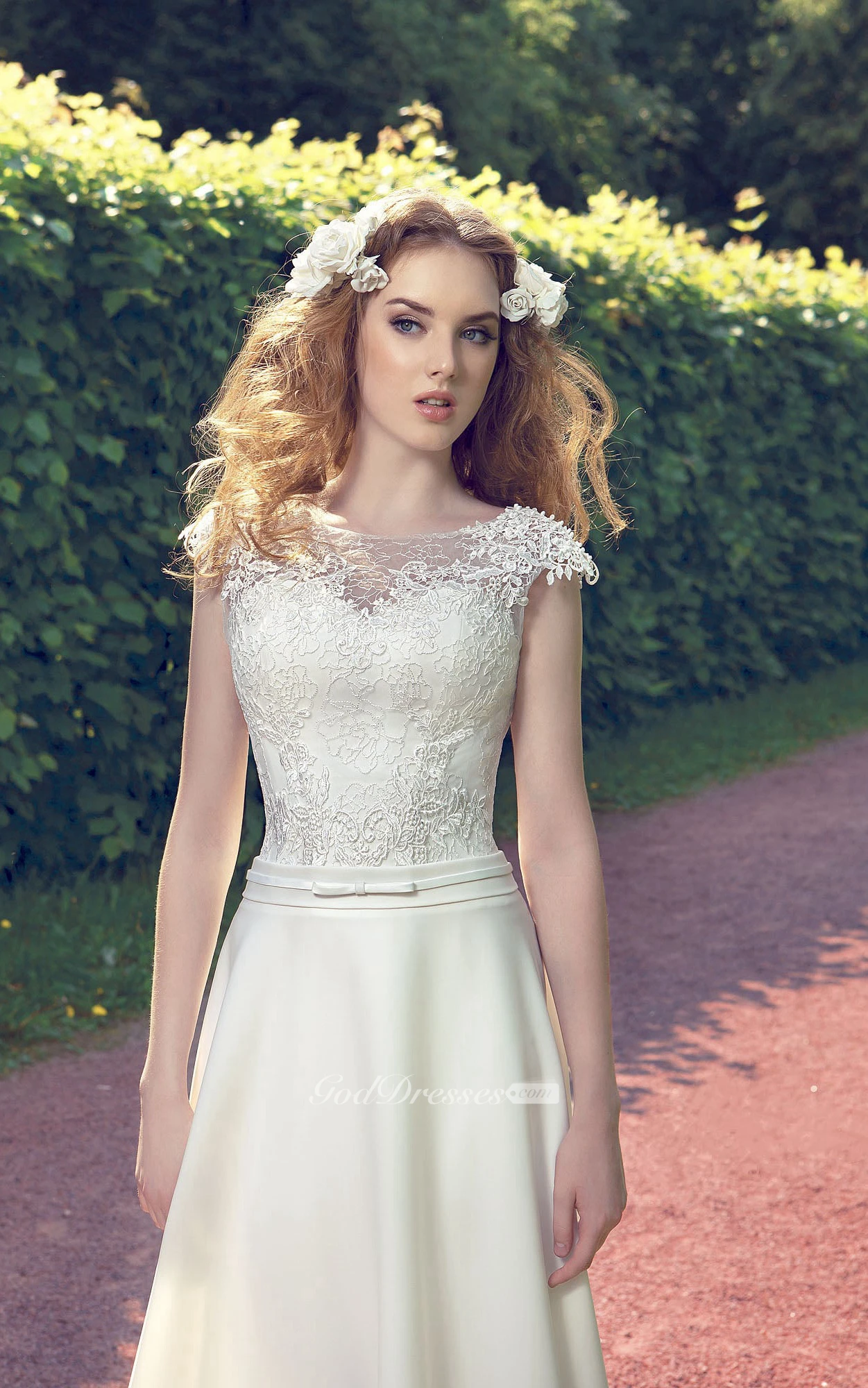 A-Line Long Scoop-Neck Cap-Sleeve Corset-Back Chiffon Lace Dress