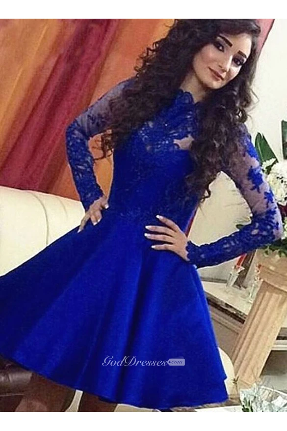 A-line Long Sleeve Satin Lace High Neck Zipper Short Mini Homecoming Dress