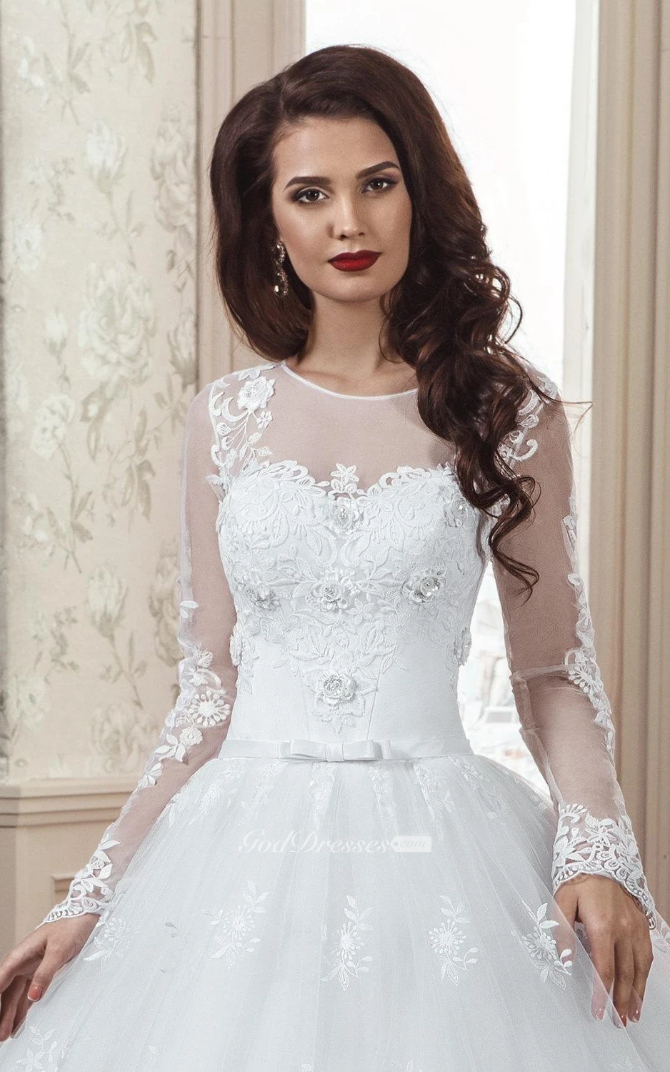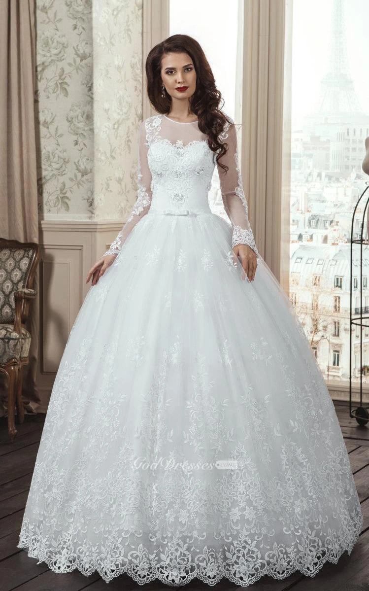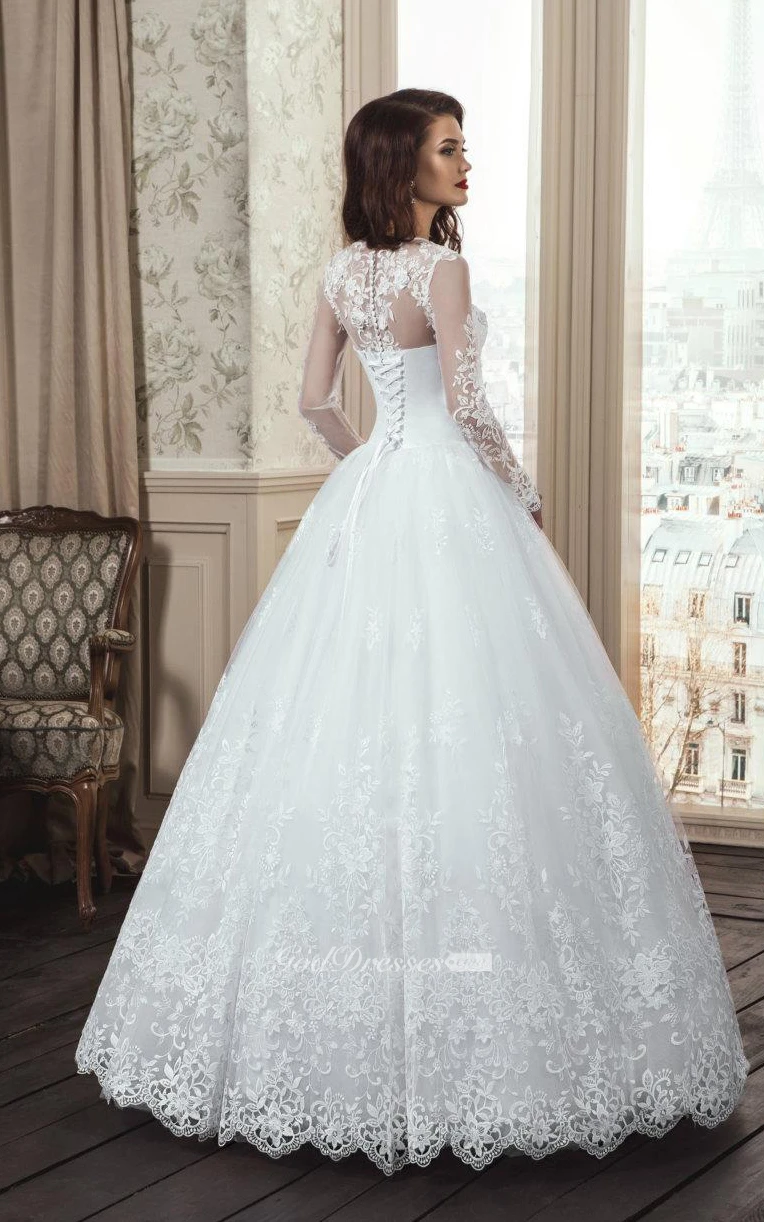 A-Line Long Sleeve Tulle Lace Dress With Flower Illusion Lace-Up Back