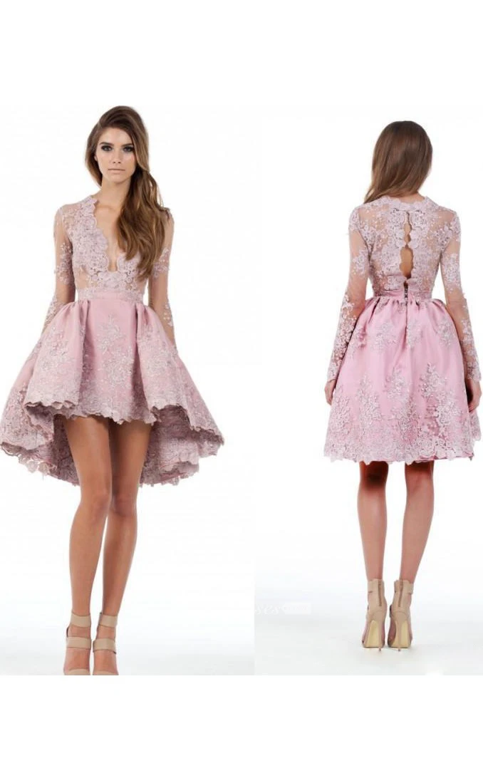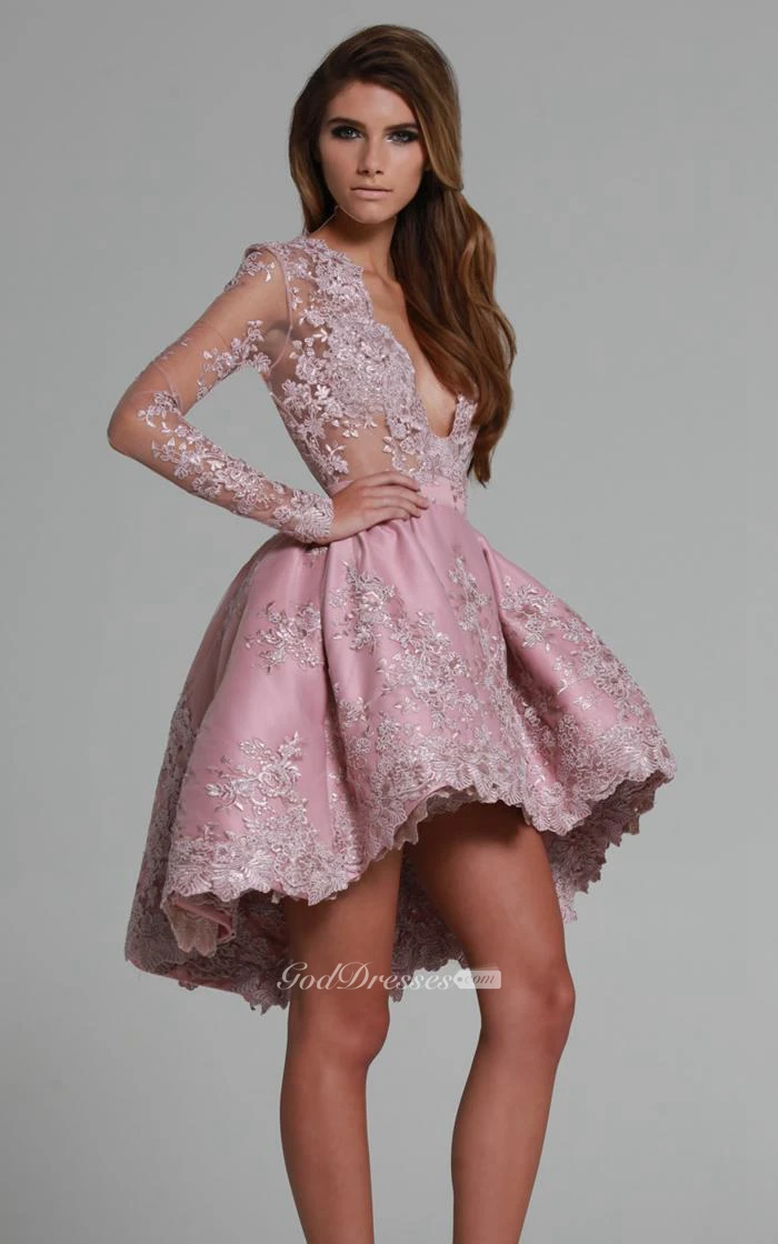 A Line Long Sleeves High Low Party Dresses With Lace Applique