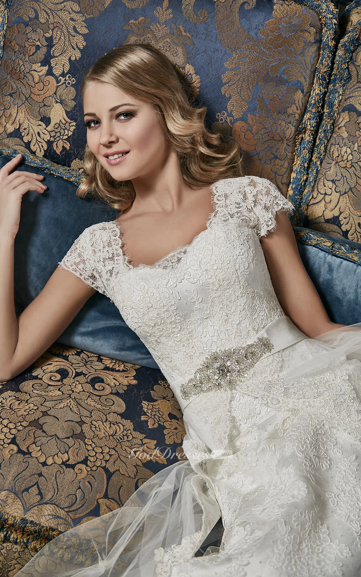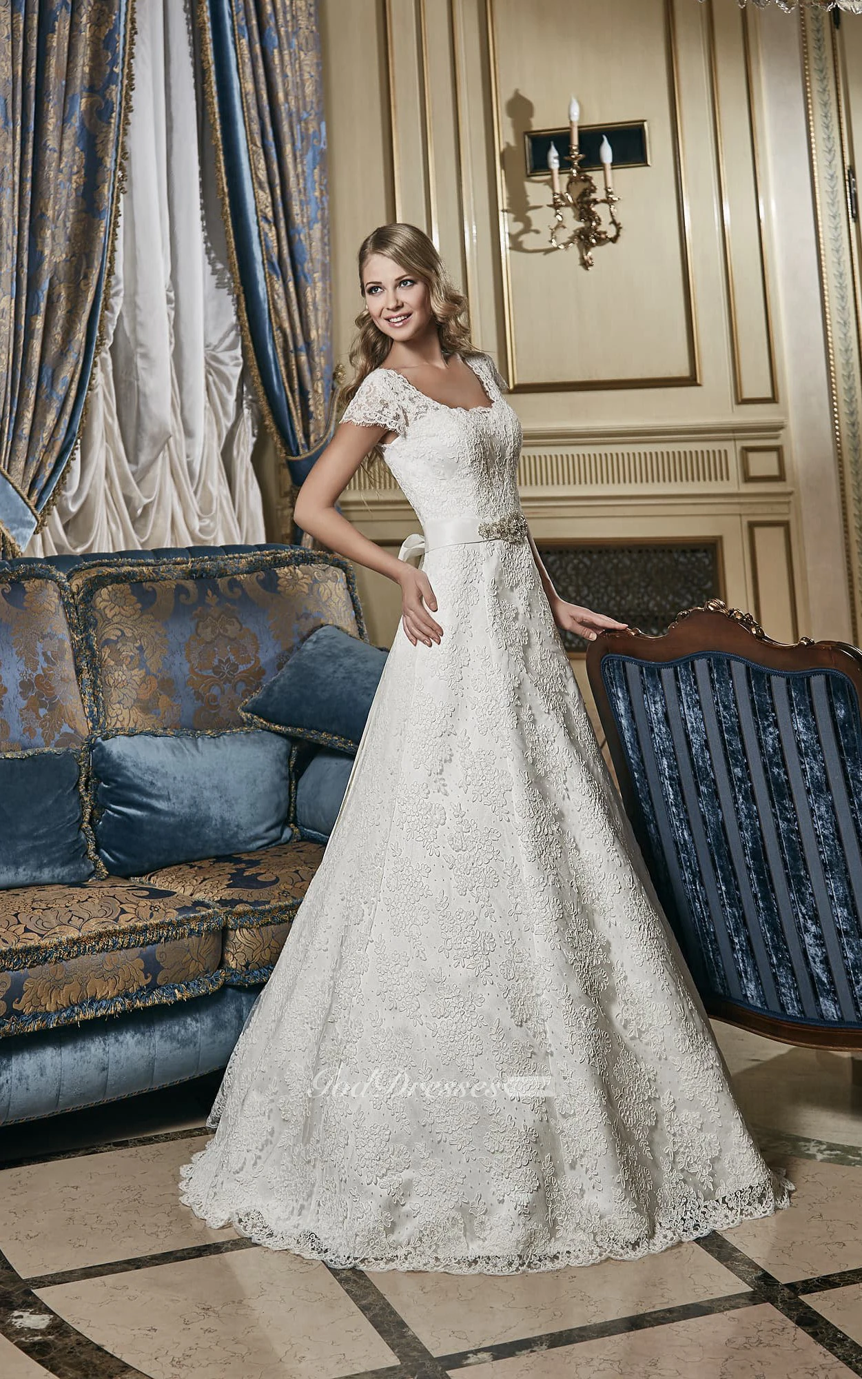 A-Line Long Square-Neck Cap-Sleeve Lace-Up Lace Dress With Beaded