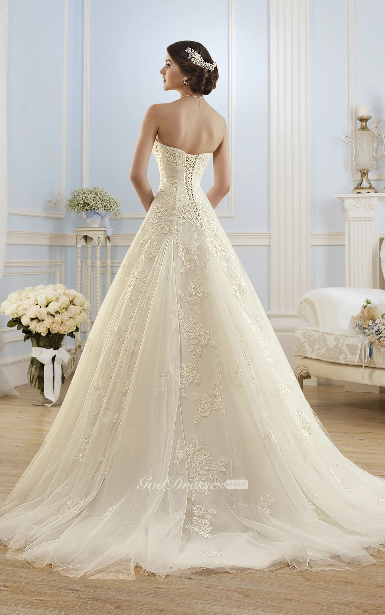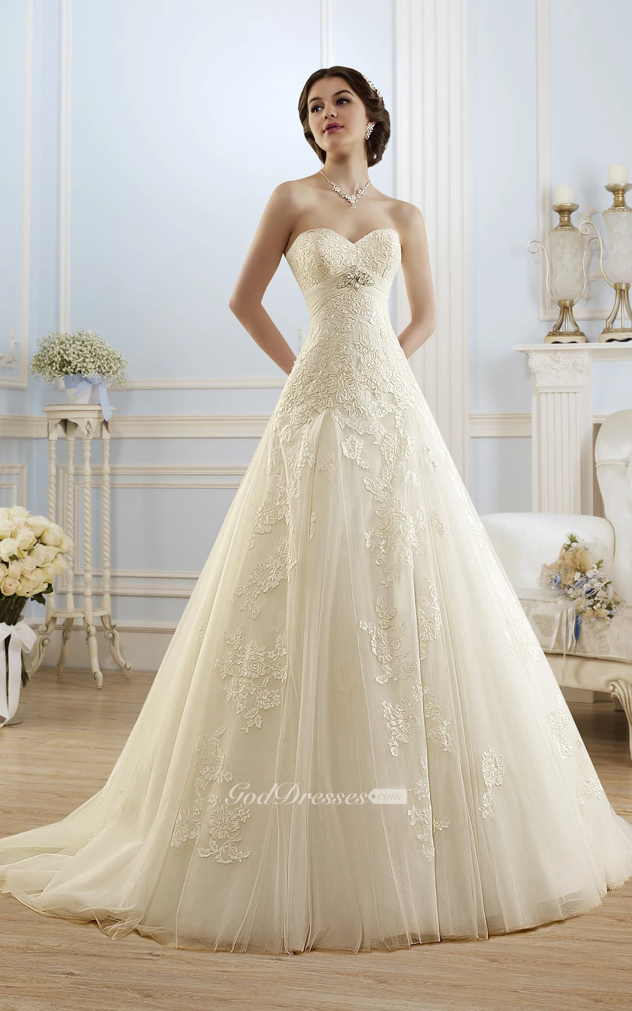 A-Line Long Sweetheart Sleeveless Lace-Up Lace Tulle Dress With Appliques And Waist Jewellery