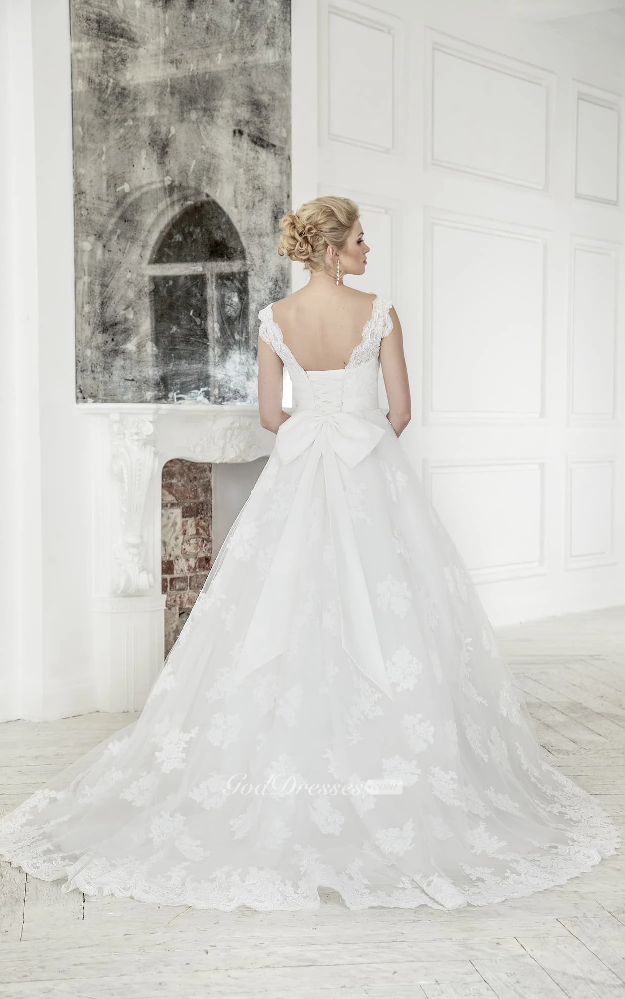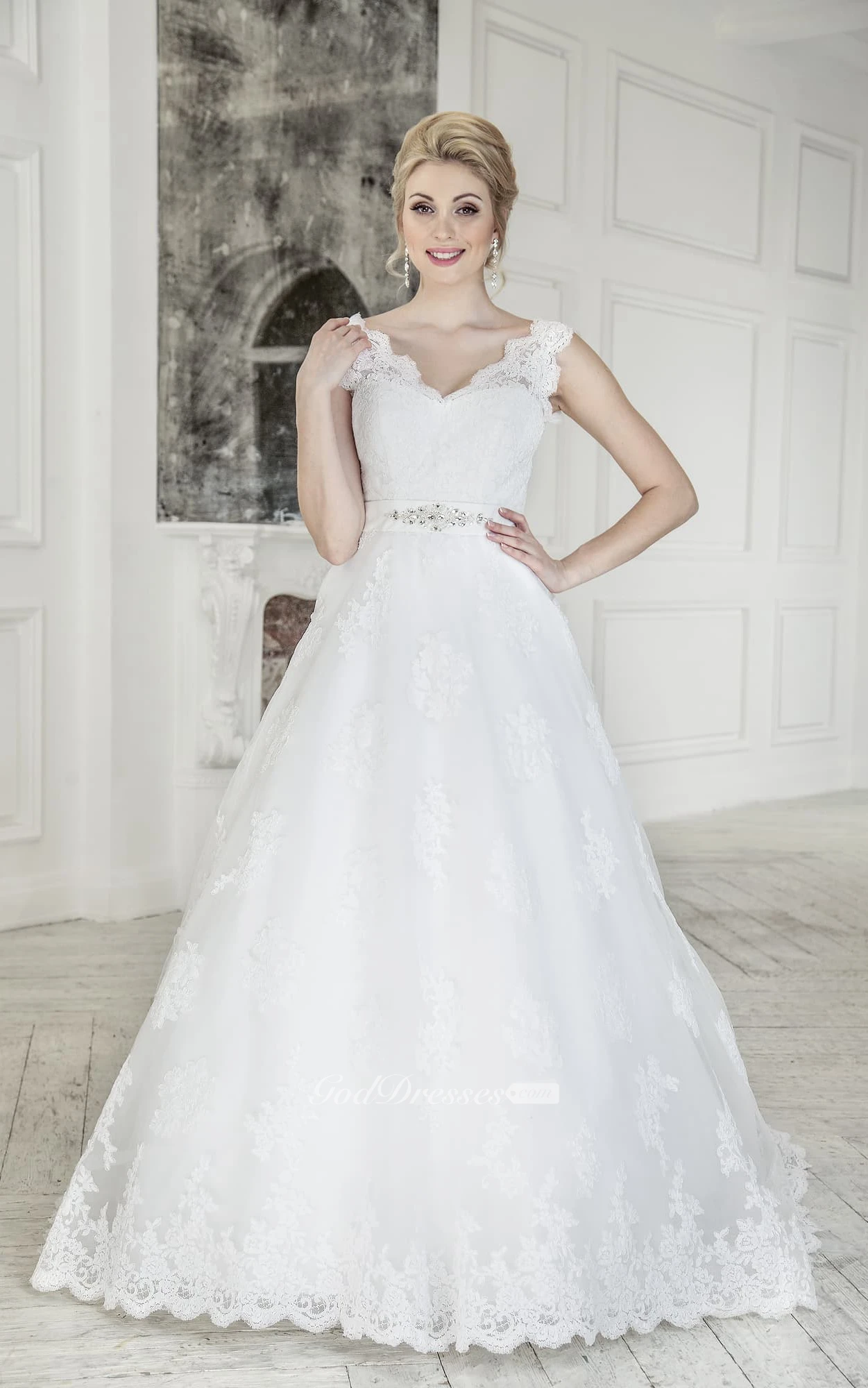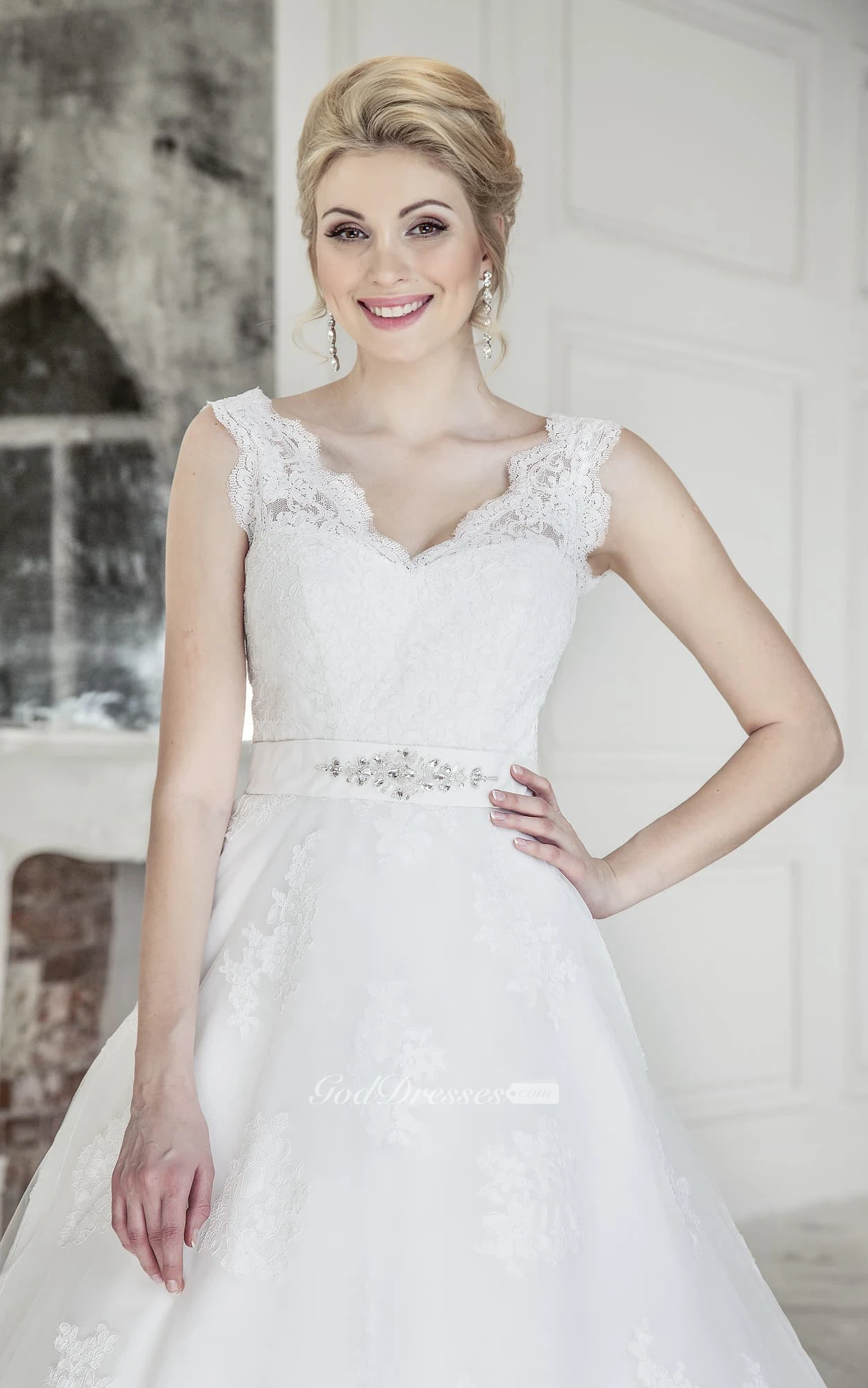 A-Line Long V-Neck Sleeveless Lace-Up Lace Dress With Appliques And Waist Jewellery