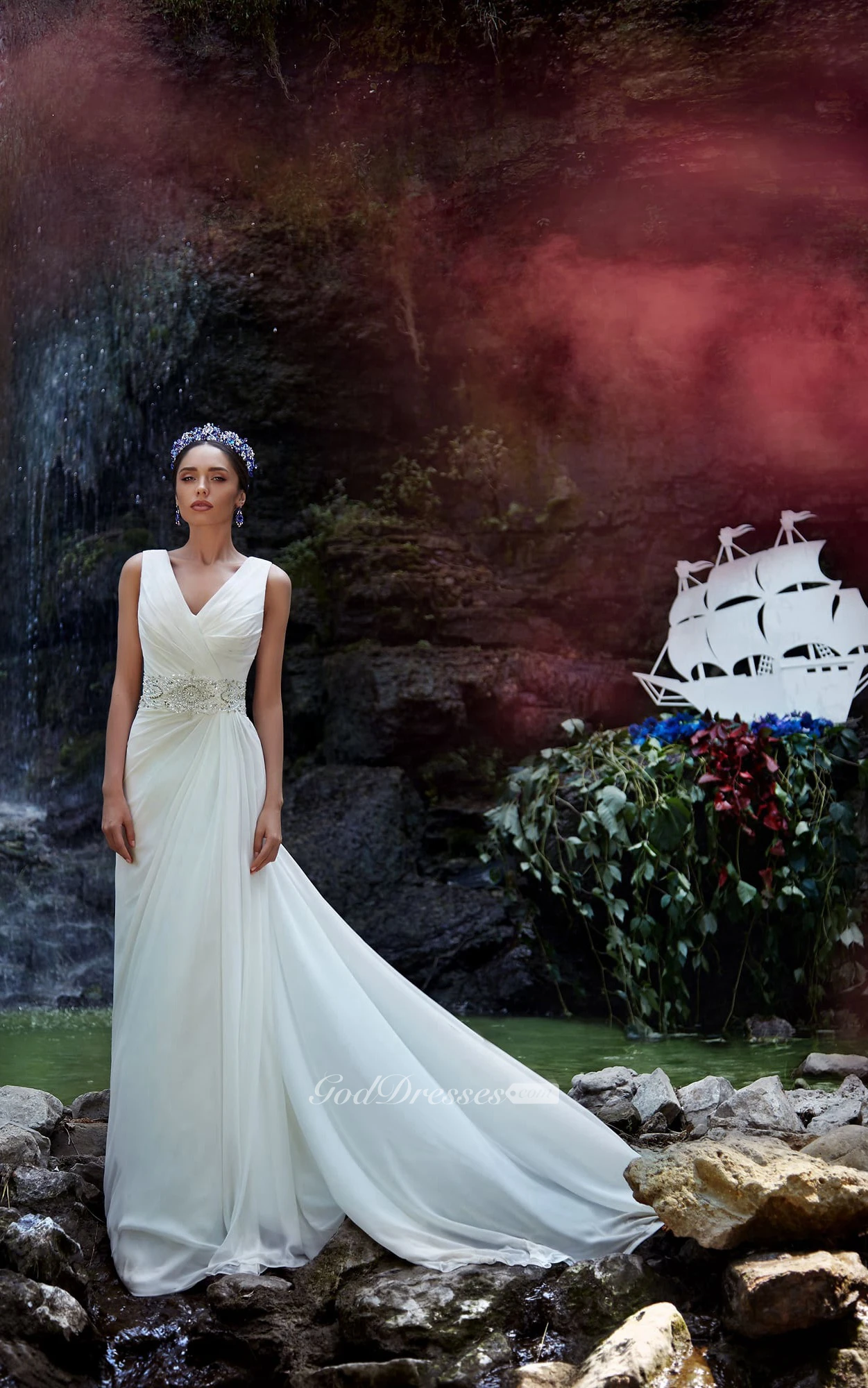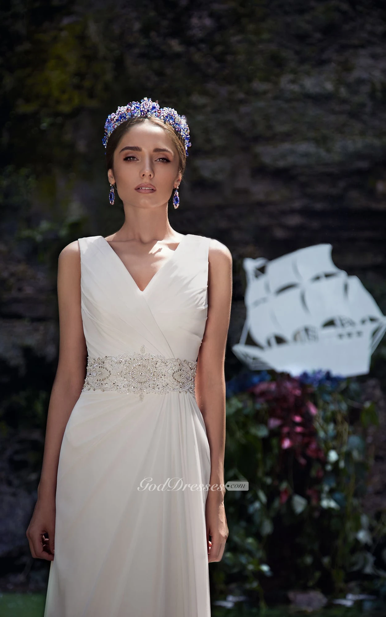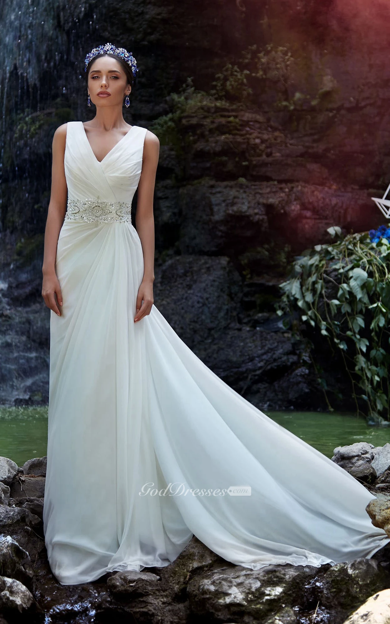 A-Line Long V-Neck Sleeveless Zipper Chiffon Dress With Beading And Ruching