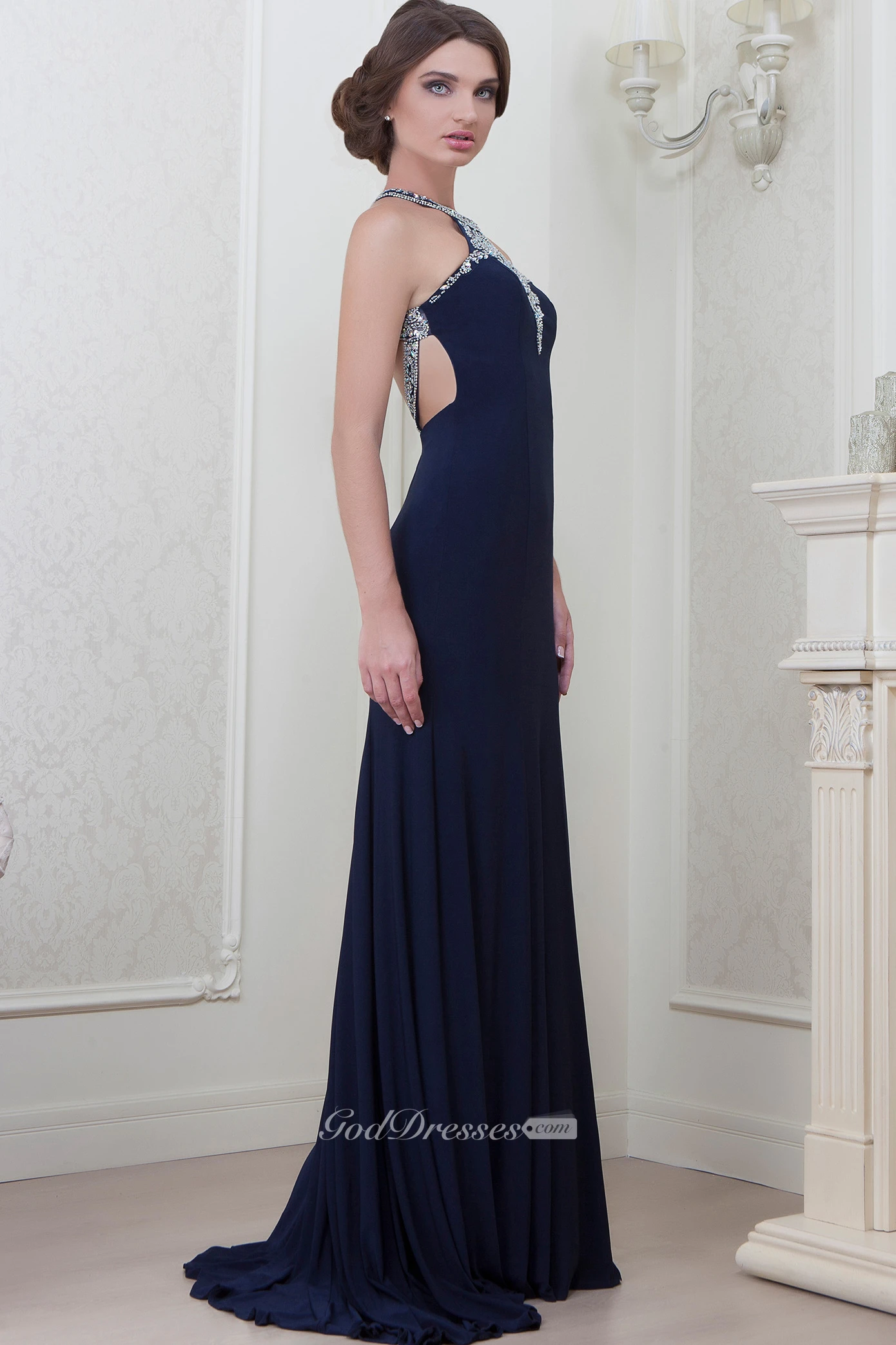 A-Line Maxi Beaded Sleeveless High-Neck Jersey Evening Dress With Pleats
