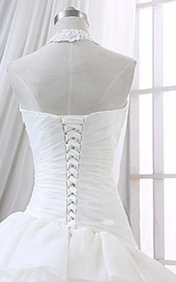 A-Line Maxi Halter Sweetheart Sleeveless Bell Ruffles Corset Back Lace Organza Dress