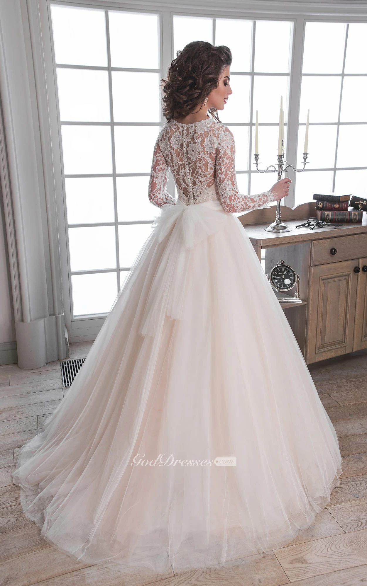 A-Line Maxi Scoop Long-Sleeve Illusion Tulle Lace Dress With Bow