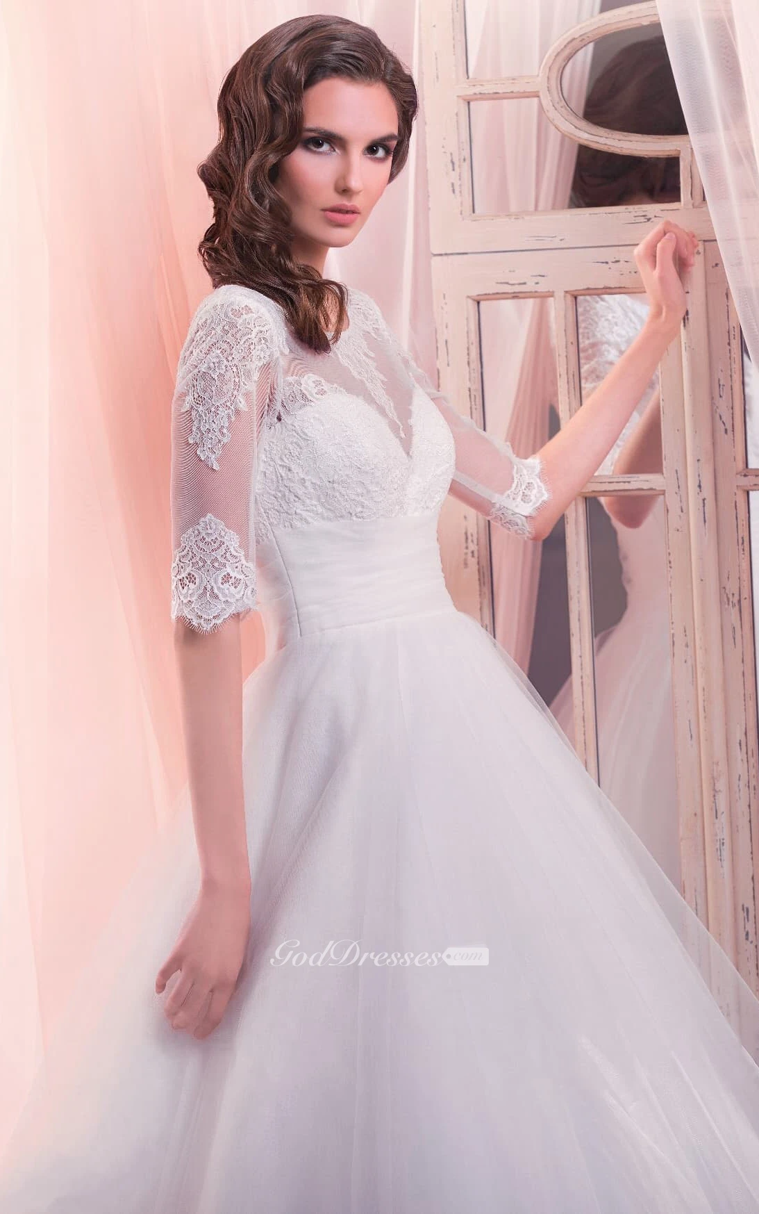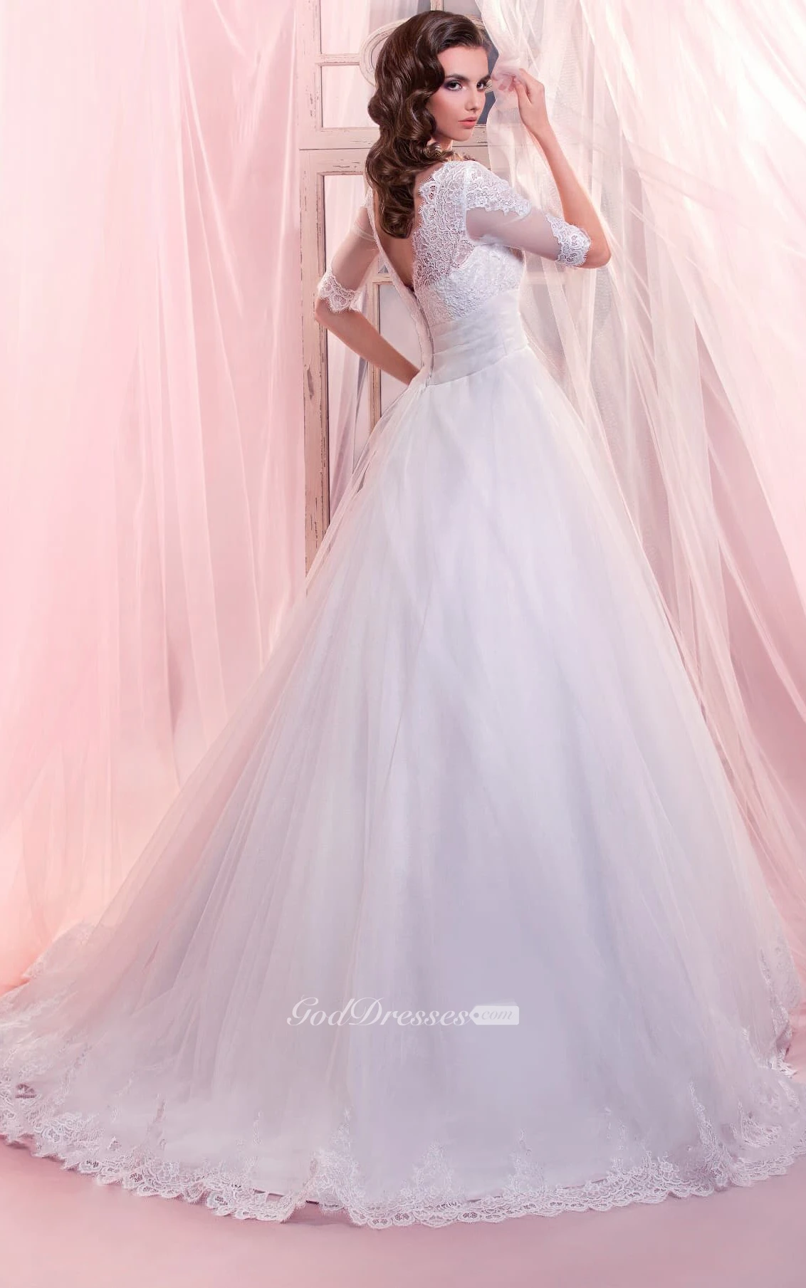 A-Line Maxi Scoop-Neck T-Shirt-Sleeve Lace-Up Organza Dress With Appliques