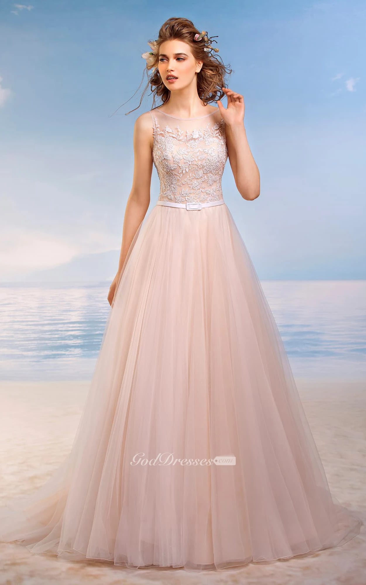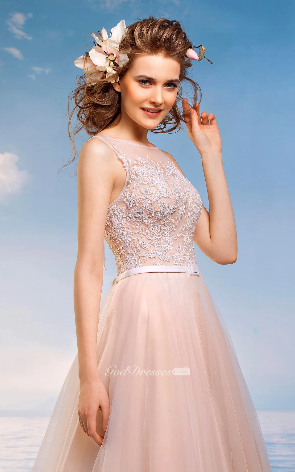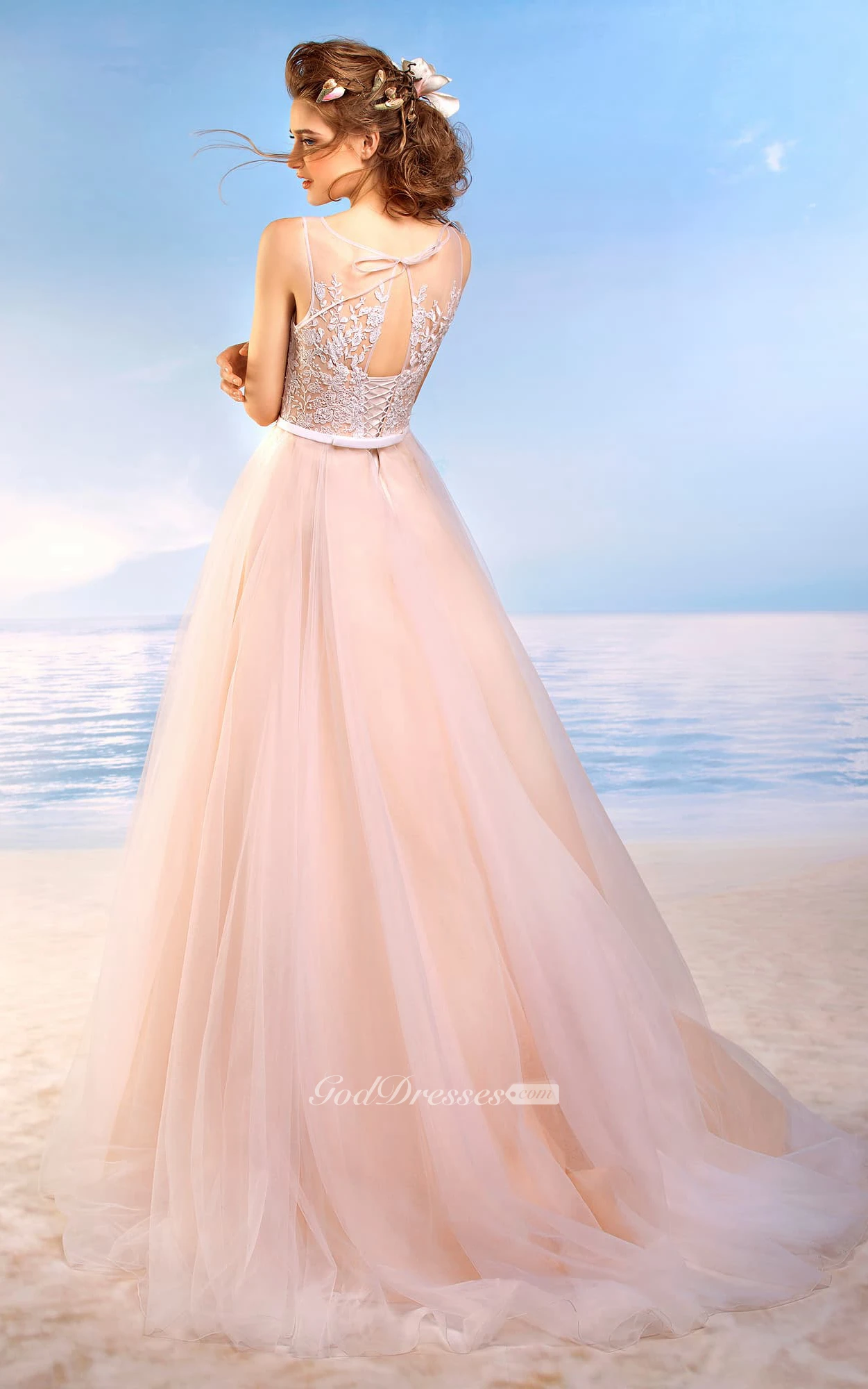 A-Line Maxi Scoop Sleeveless Lace-Up Tulle Dress With Appliques And Pleats