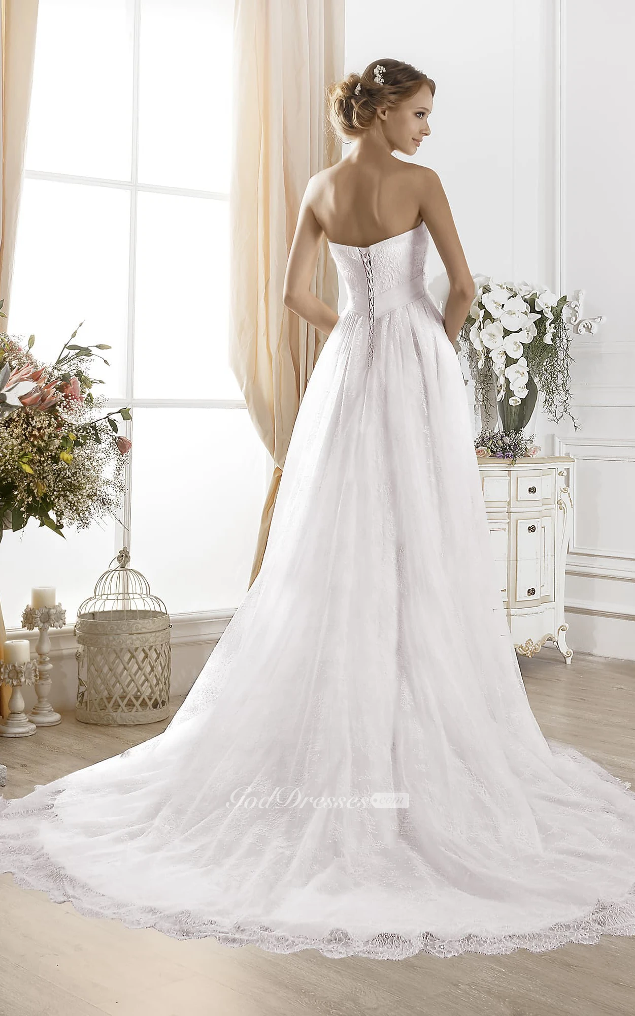 A-Line Maxi Strapless Sleeveless Lace-Up Lace Dress With Beading