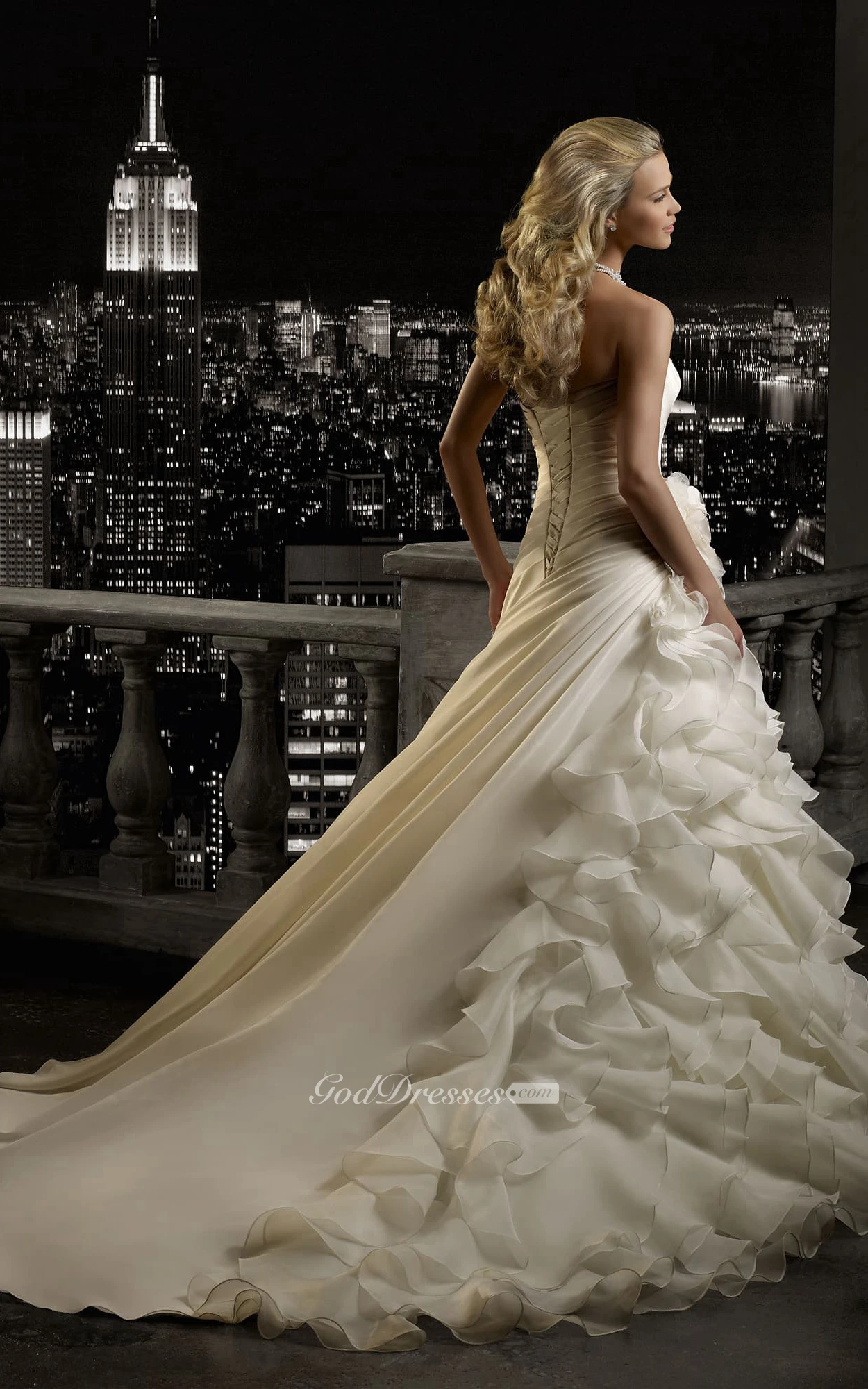 A-Line Maxi Strapless Sleeveless Lace-Up Organza Dress With Cascading Ruffles And Flower