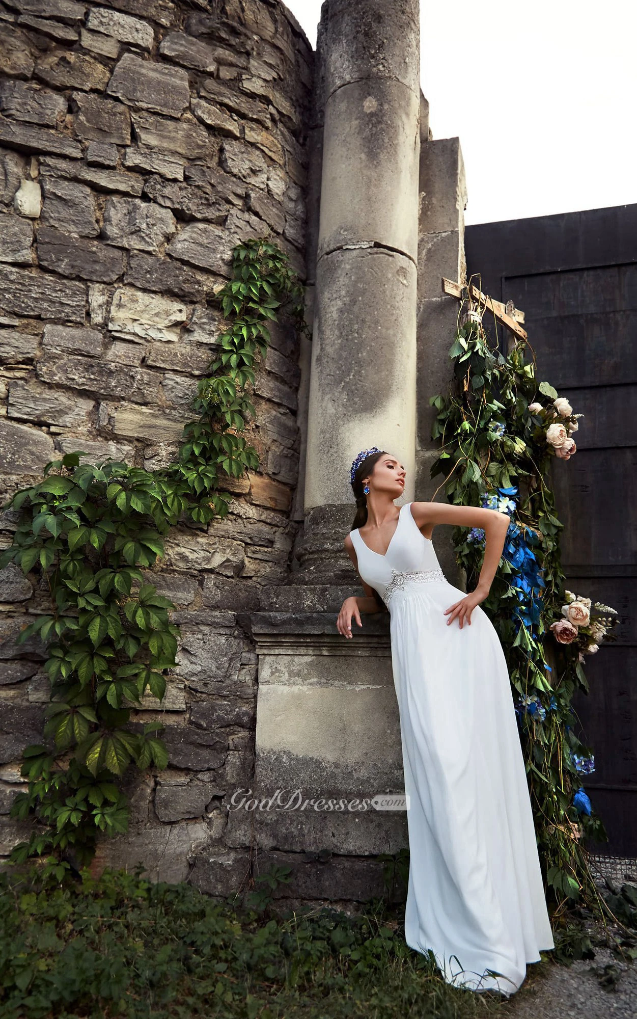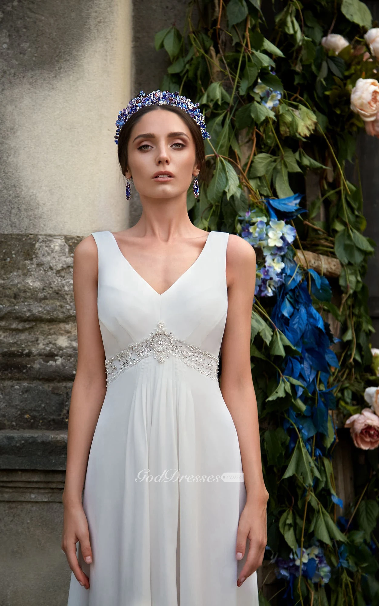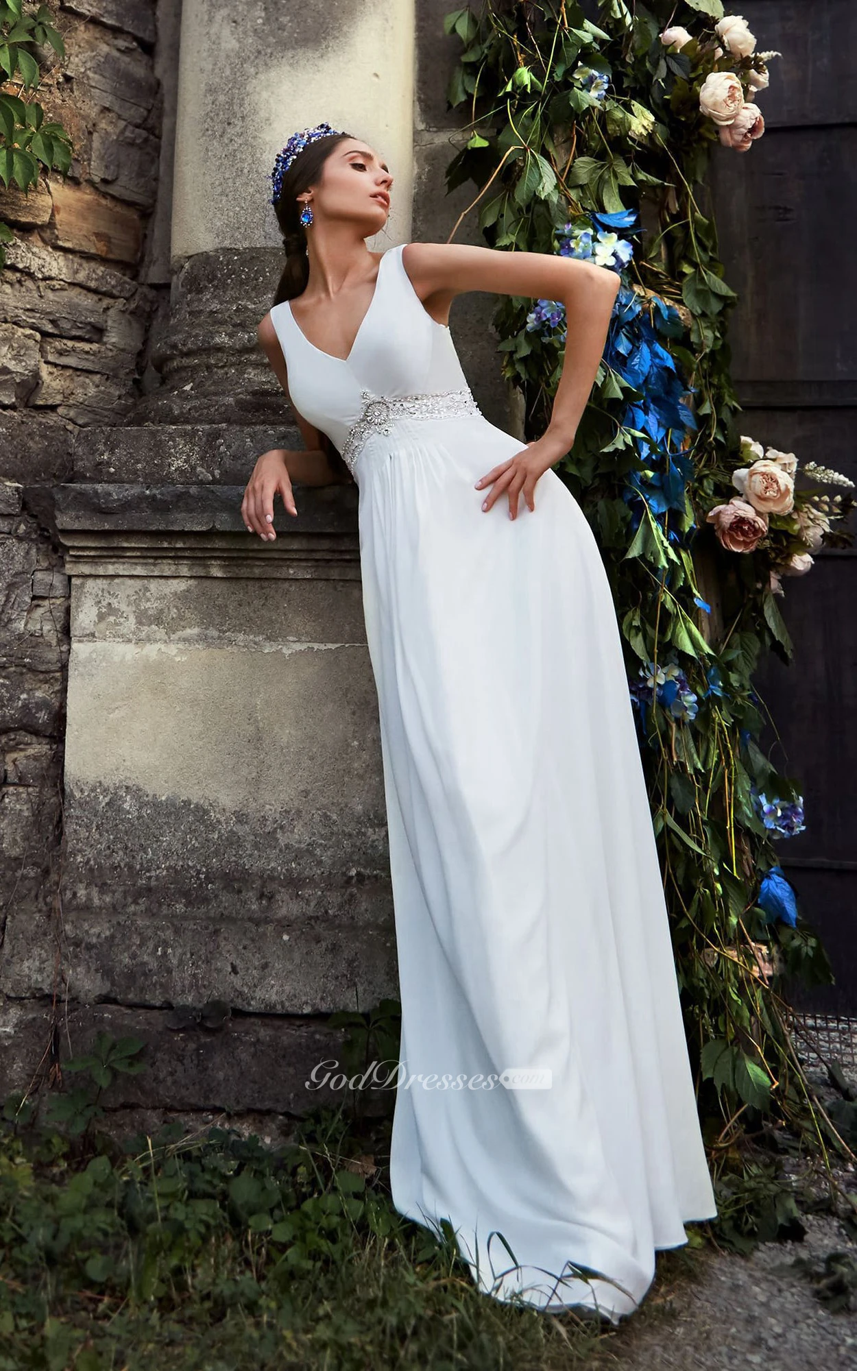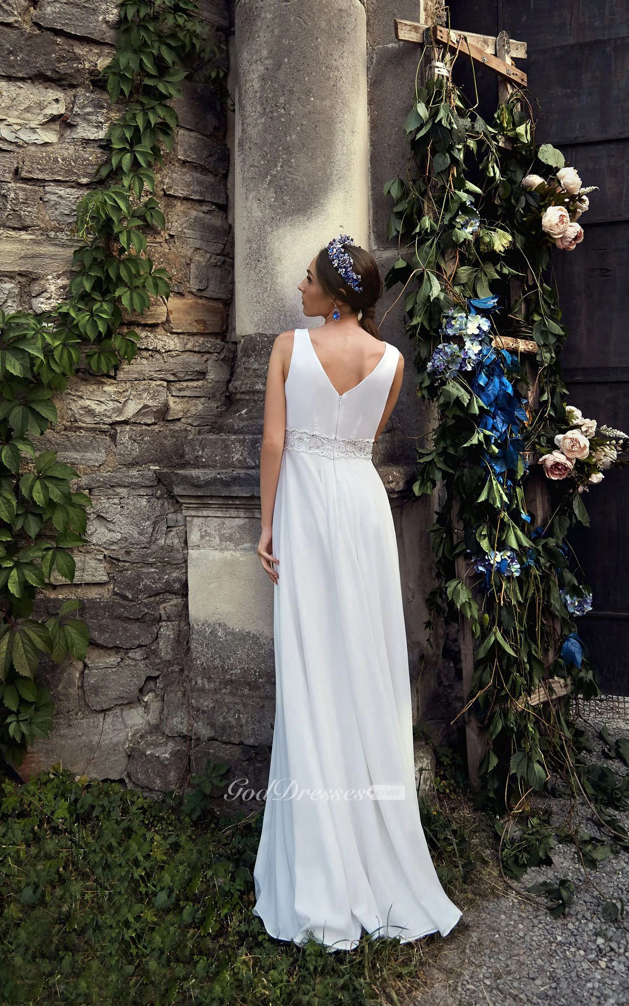 A-Line Maxi V-Neck Sleeveless Empire Zipper Chiffon Dress With Beading