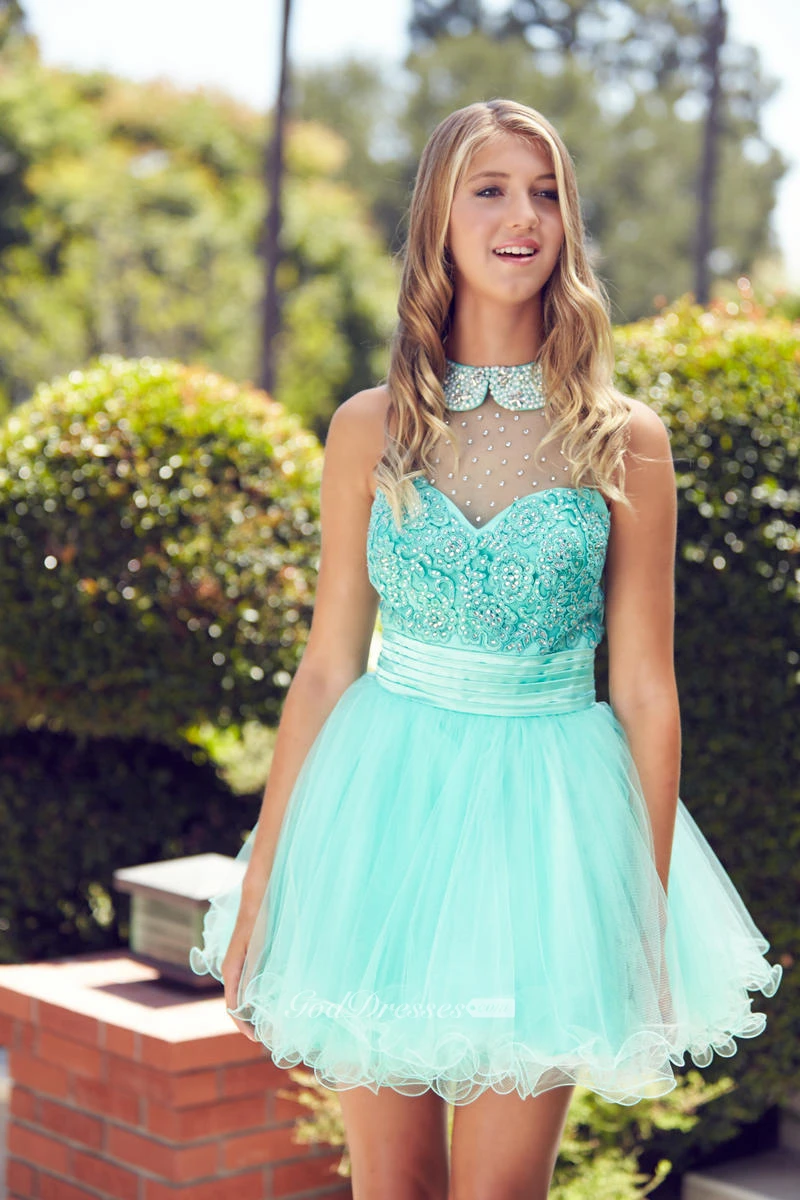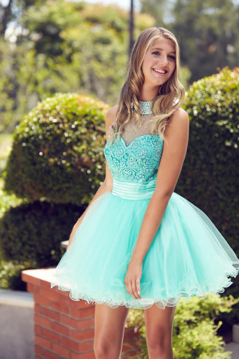 A-Line Mini High Neck Sleeveless Tulle Illusion Dress With Beading And Ruffles