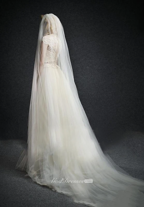A-Line Mini Jewel Bell Cap Beading Appliques Court Train Button Tulle Lace Dress