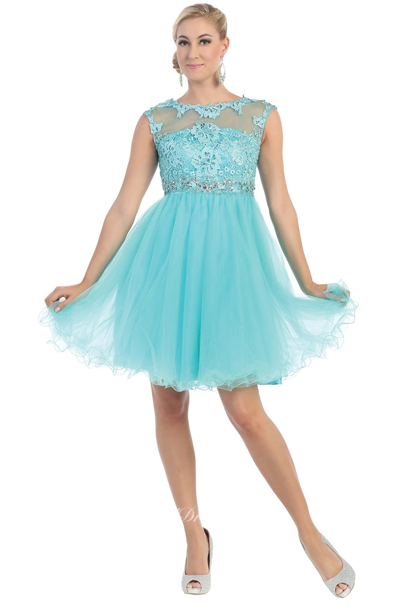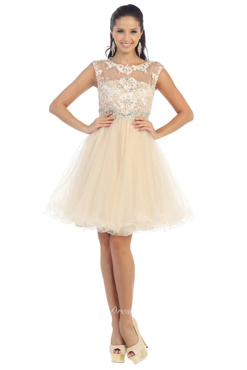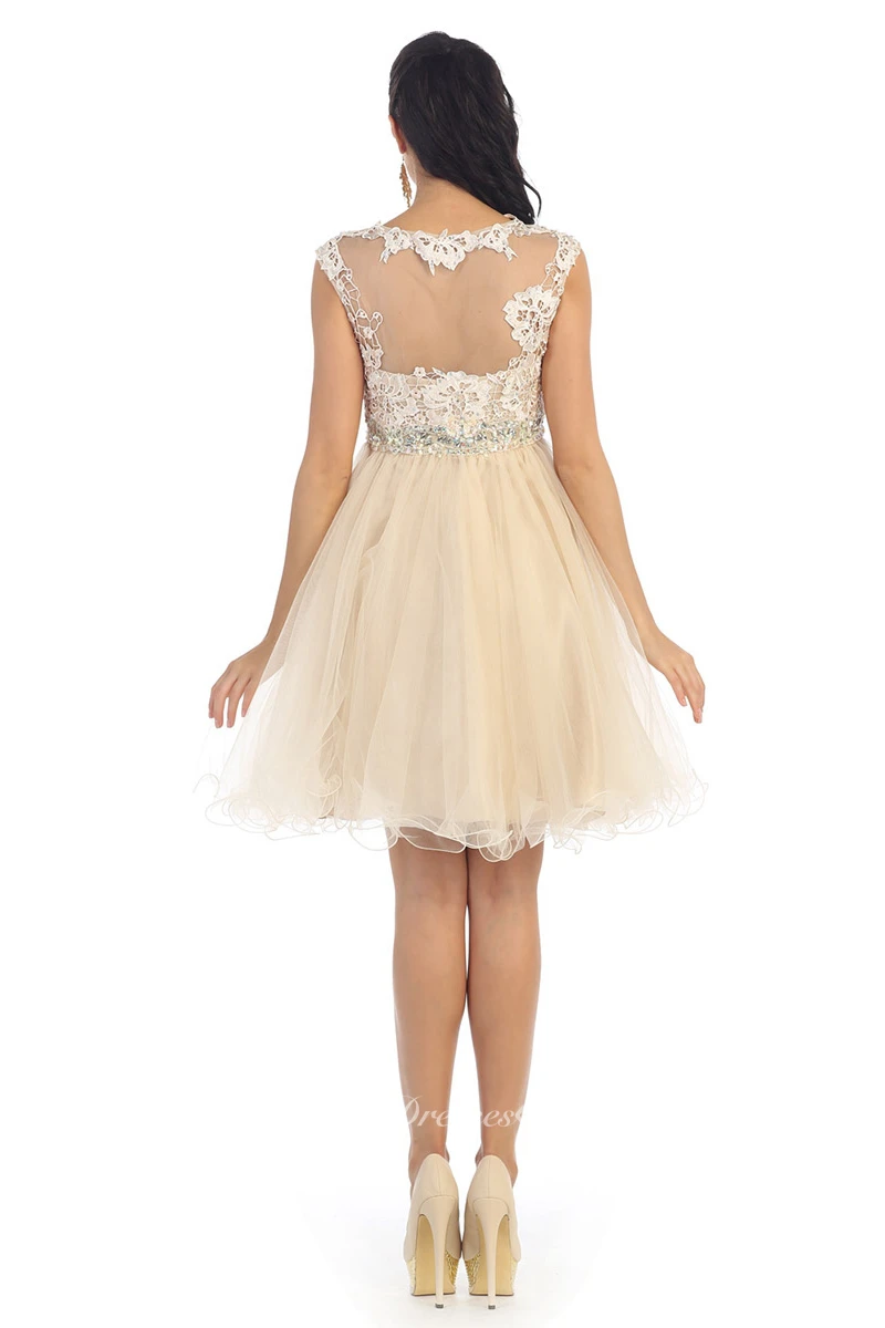 A-Line Mini Jewel-Neck Cap-Sleeve Tulle Illusion Dress With Appliques And Waist Jewellery