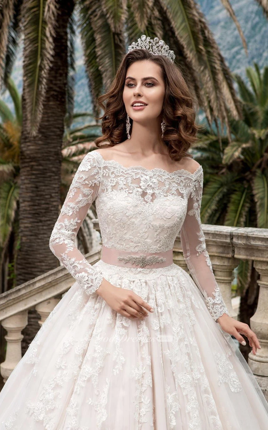 A-Line Mini Off-The-Shoulder Long Sleeve Bell Pleats Beading Appliques Court Train Button Lace Dress
