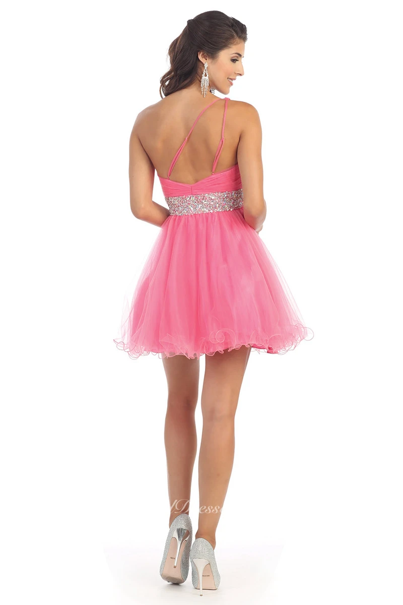 A-Line Mini One-Shoulder Tulle Straps Dress With Ruffles And Waist Jewellery