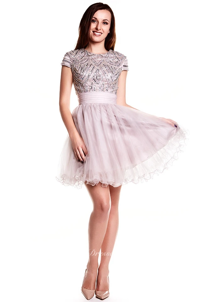 A-Line Mini Scoop Neck Sequined Cap Sleeve Tulle Prom Dress With Keyhole
