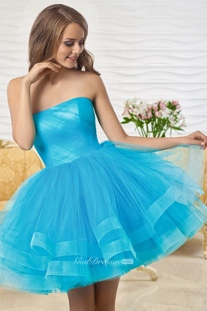 A-Line Mini Sleeveless Ruched Strapless Tulle Prom Dress With Tiers