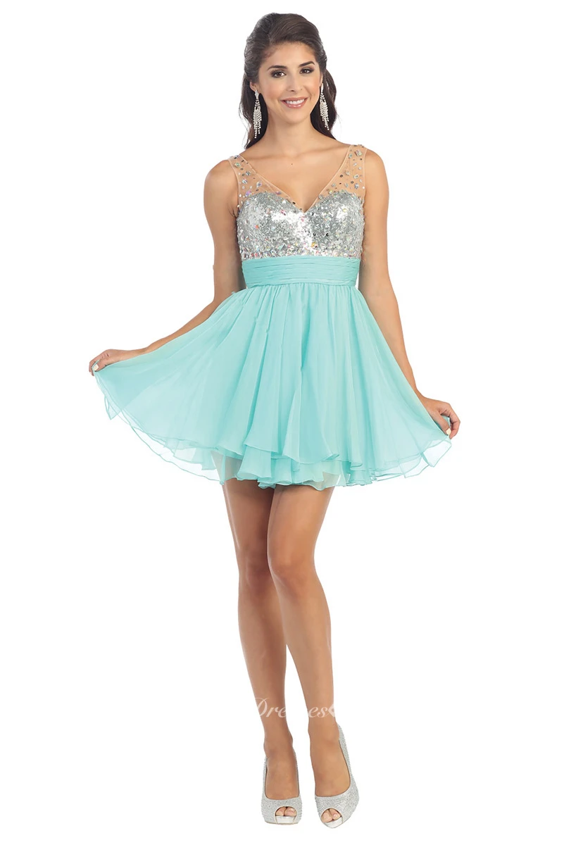 A-Line Mini V-Neck Sleeveless Chiffon Sequins Low-V Back Dress With Beading