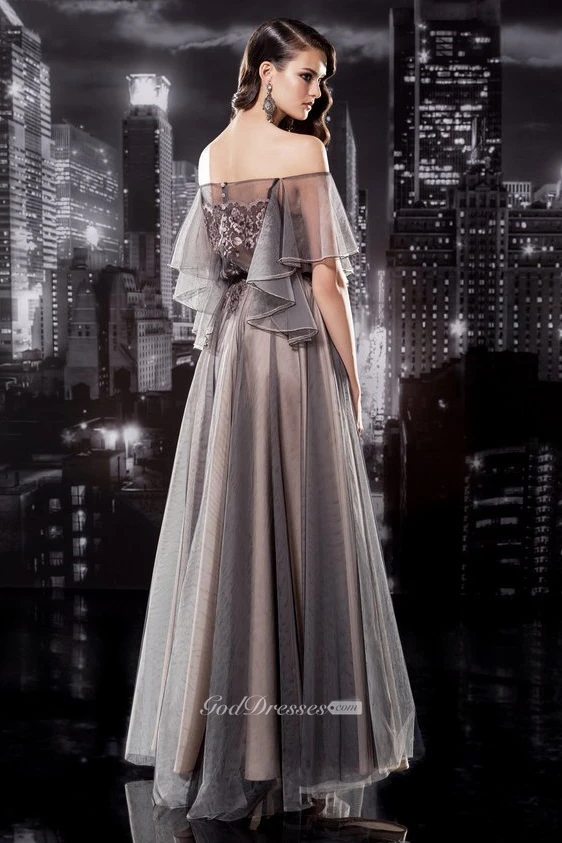 A-Line Off-The-Shoulder Short Sleeve Tulle Illusion Dress With Appliques And Pleats
