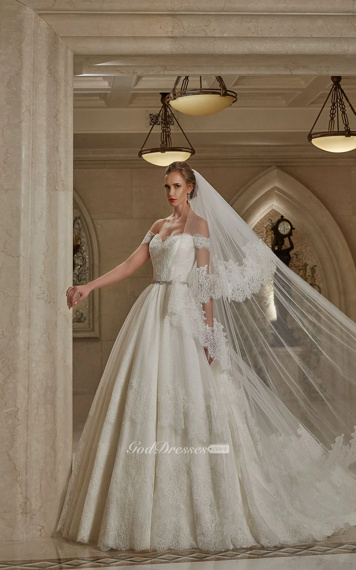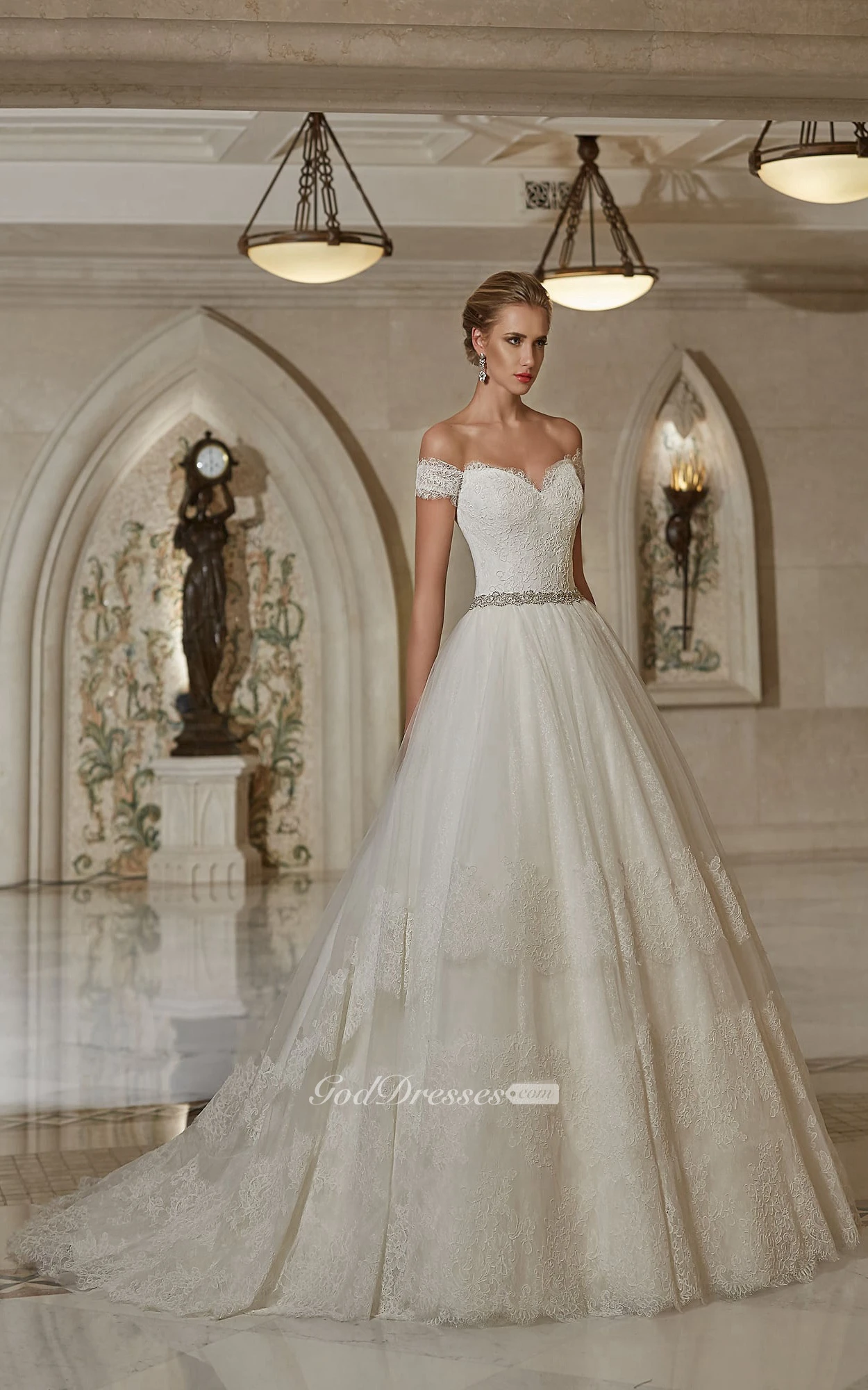 A-line Off-the-shoulder Sweetheart V Back Lace Dress With Crystal Detailing