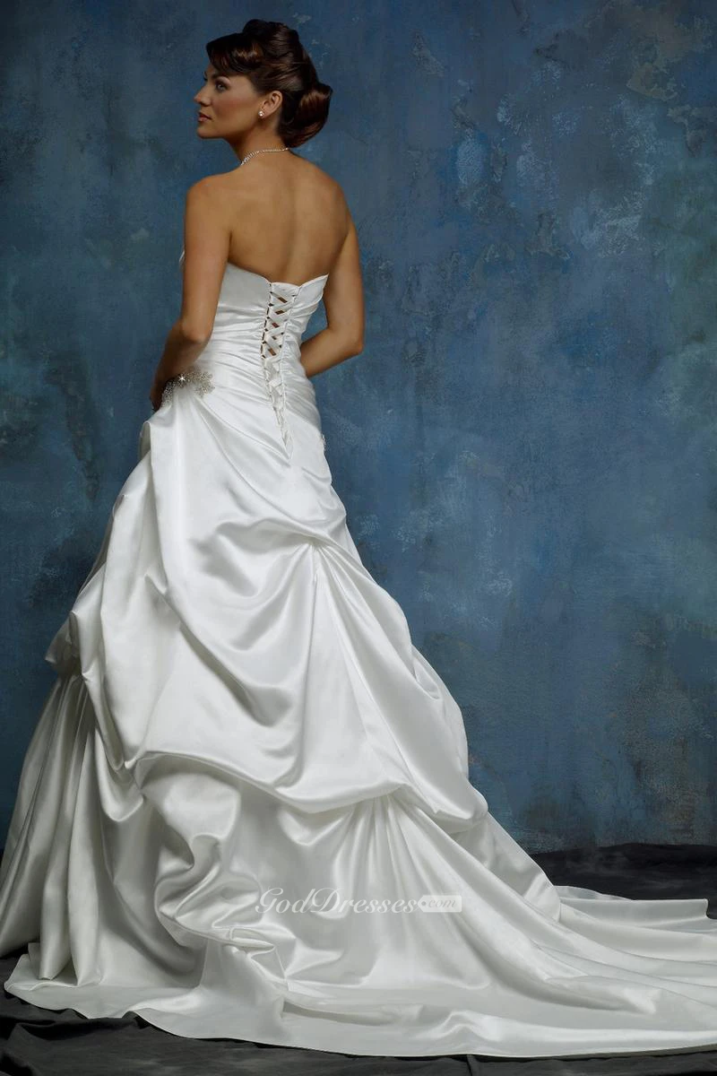 A-Line Pick-Up Sweetheart Maxi Sleeveless Satin Wedding Dress With Appliques And Cascading Ruffles