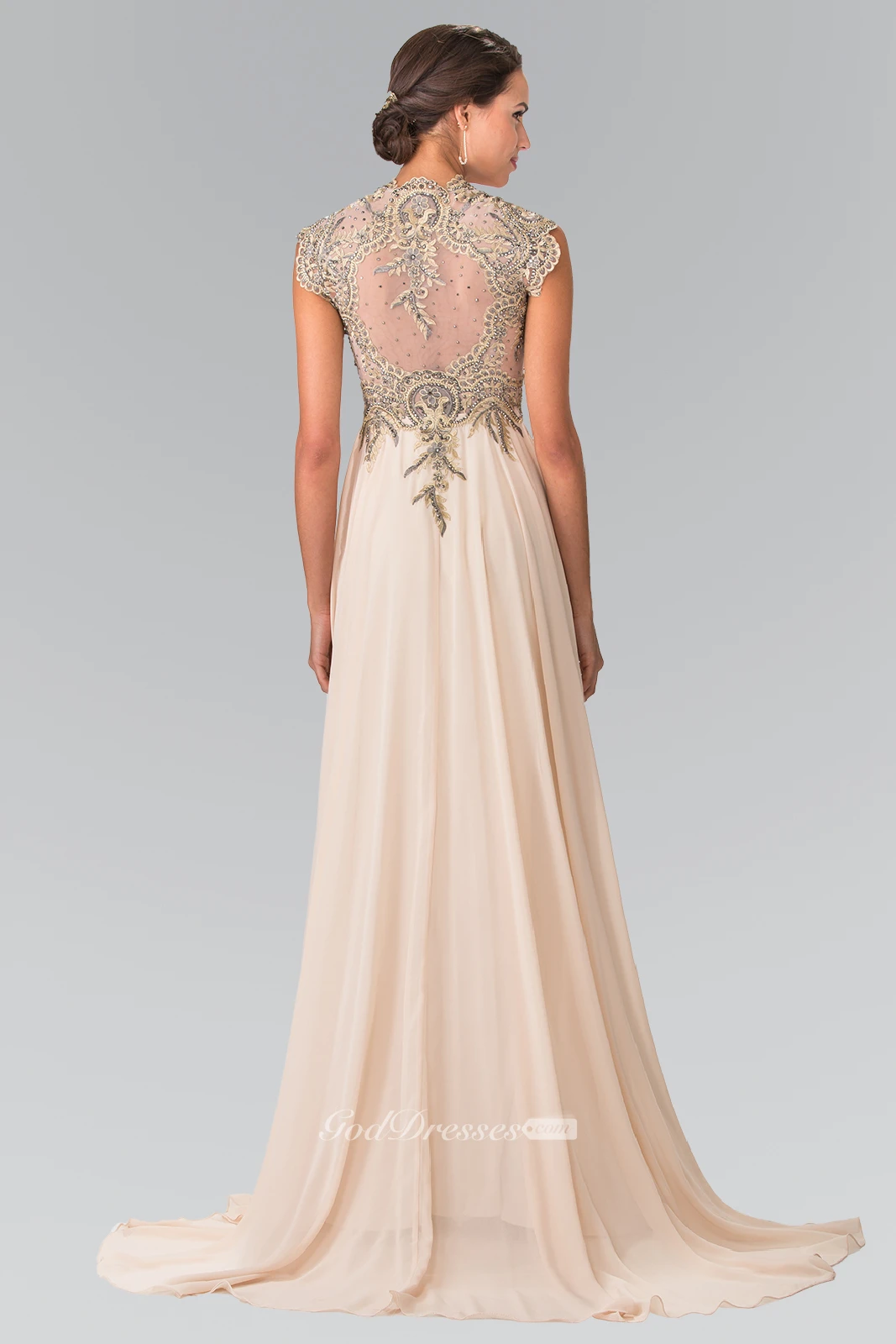A-Line Queen Anne Sleeveless Chiffon Illusion Dress With Beading And Pleats