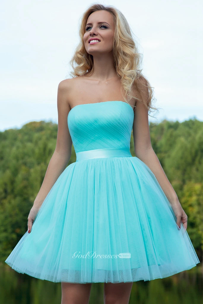 A Line Ruched Sleeveless Strapless Short Mini Tulle Prom Dress With Ribbon