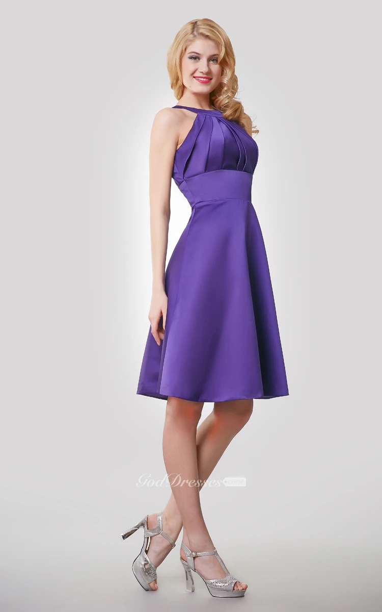 This short satin dress makes the perfect cocktail ensemble. The bodice has an empire waist and a high neckline with pleating. The dress has an A-line silhouette, and the circle skirt hits right at the knee. The dramatic keyhole back is sure to draw everyone’s attention as you walk by, upgrading the simple yet elegant shape of this dress.